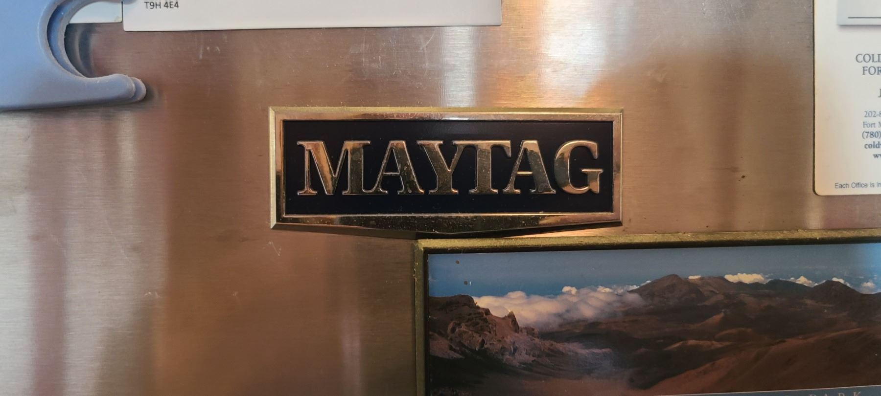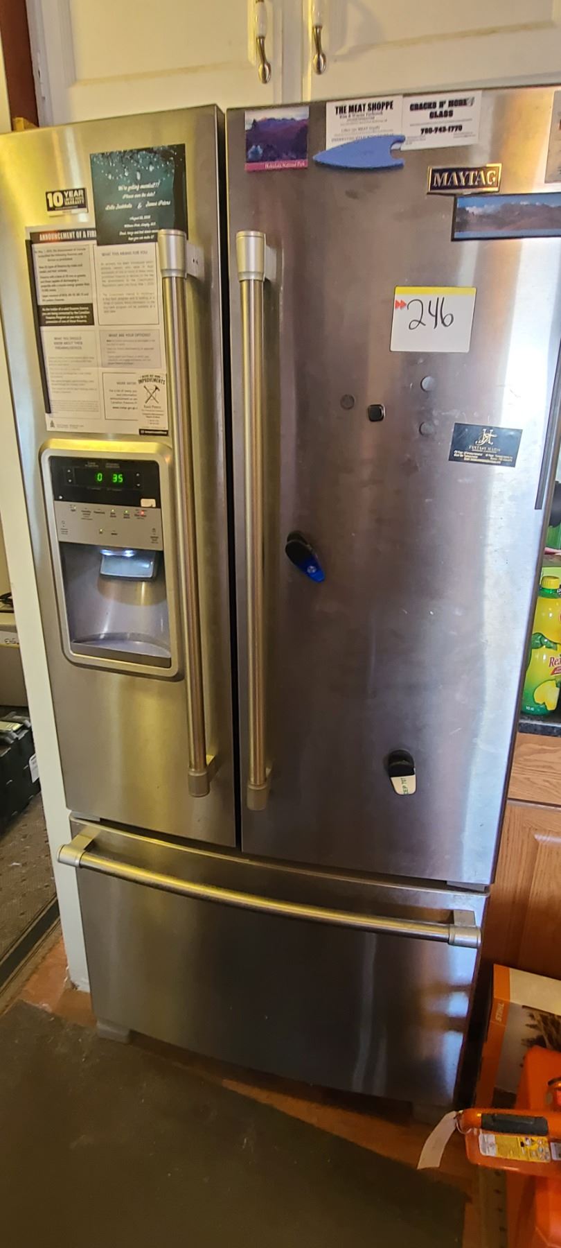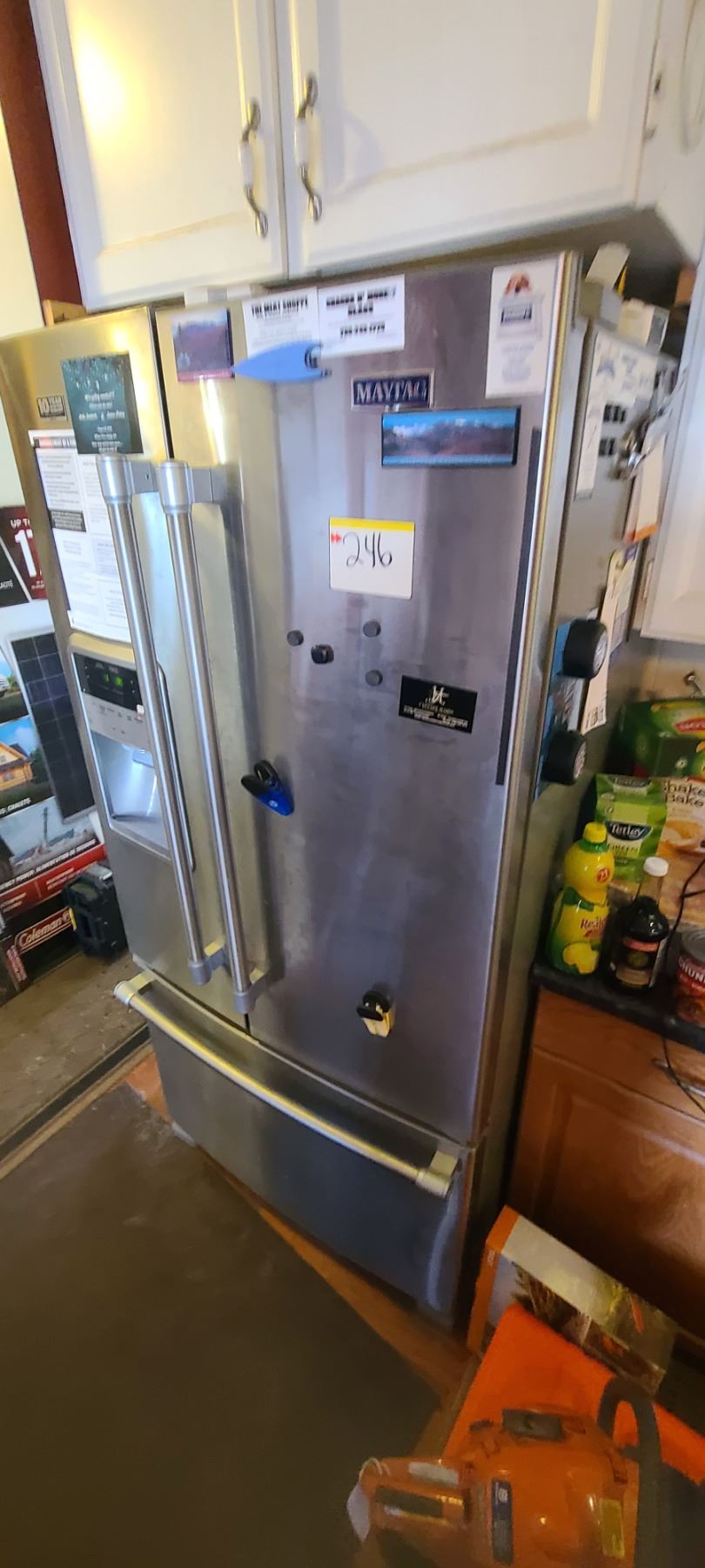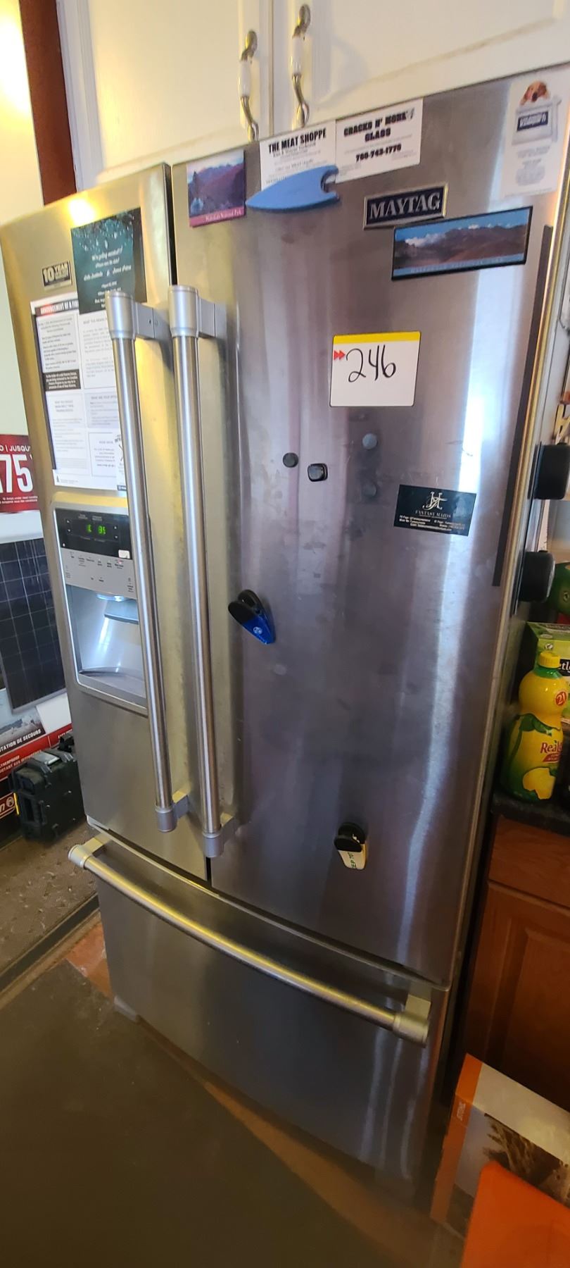 MAYTAG UPRIGHT STAINLESS STEEL TWO DOOR REFRIDGERATOR, ICE MAKER - COMES WITH CONTENTS