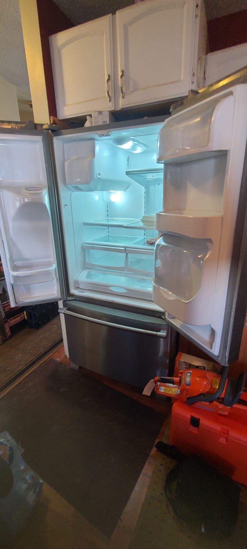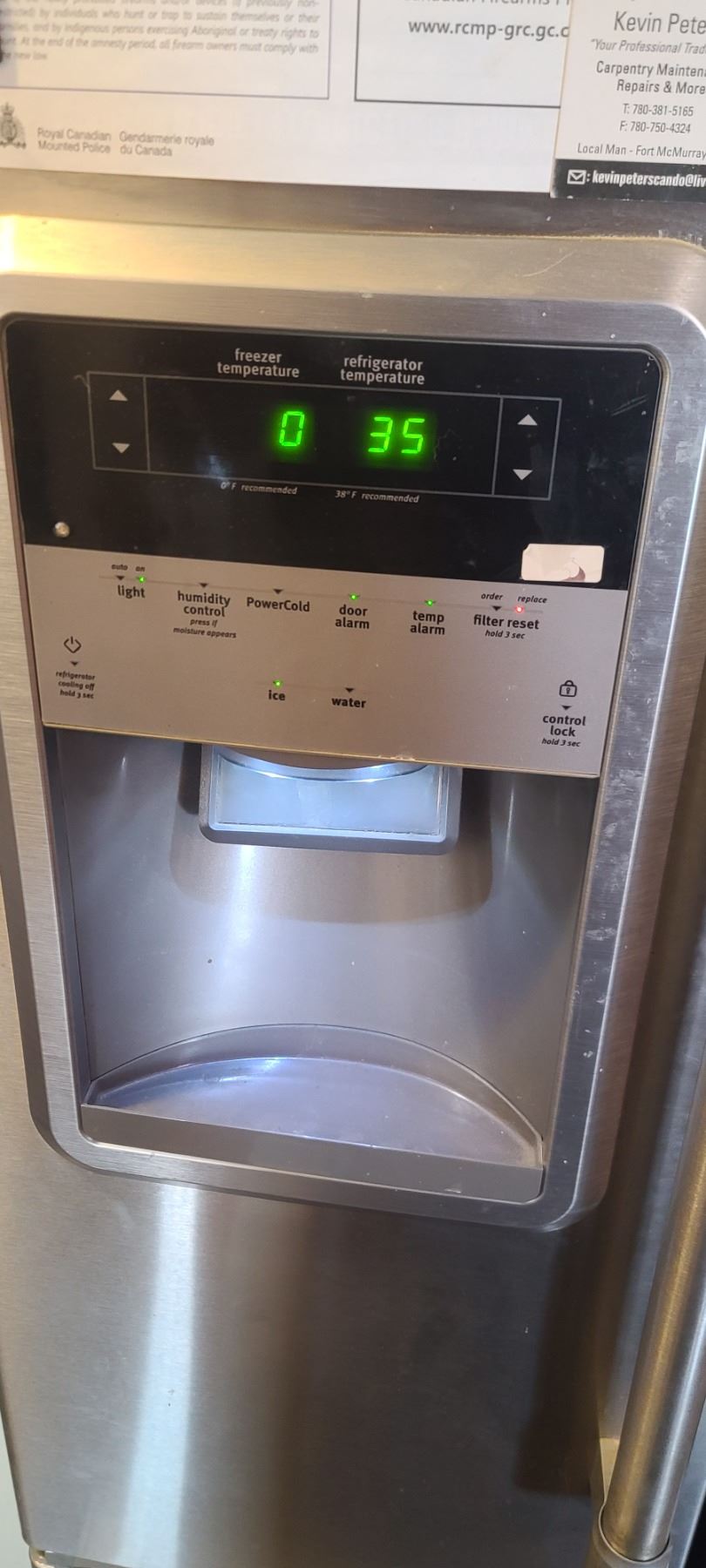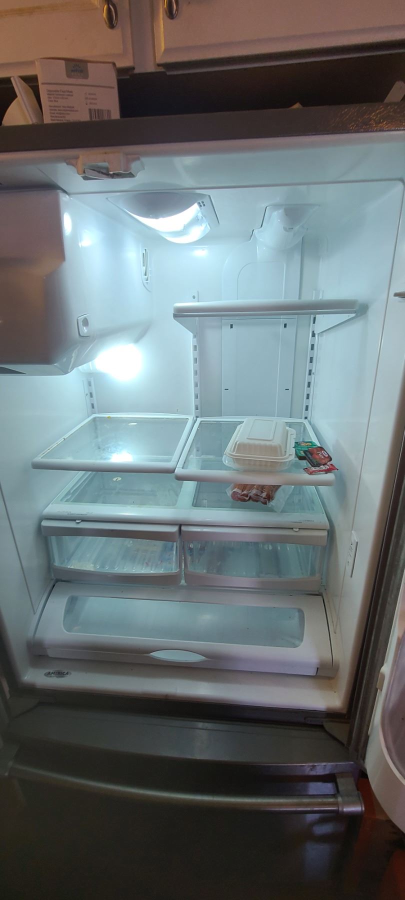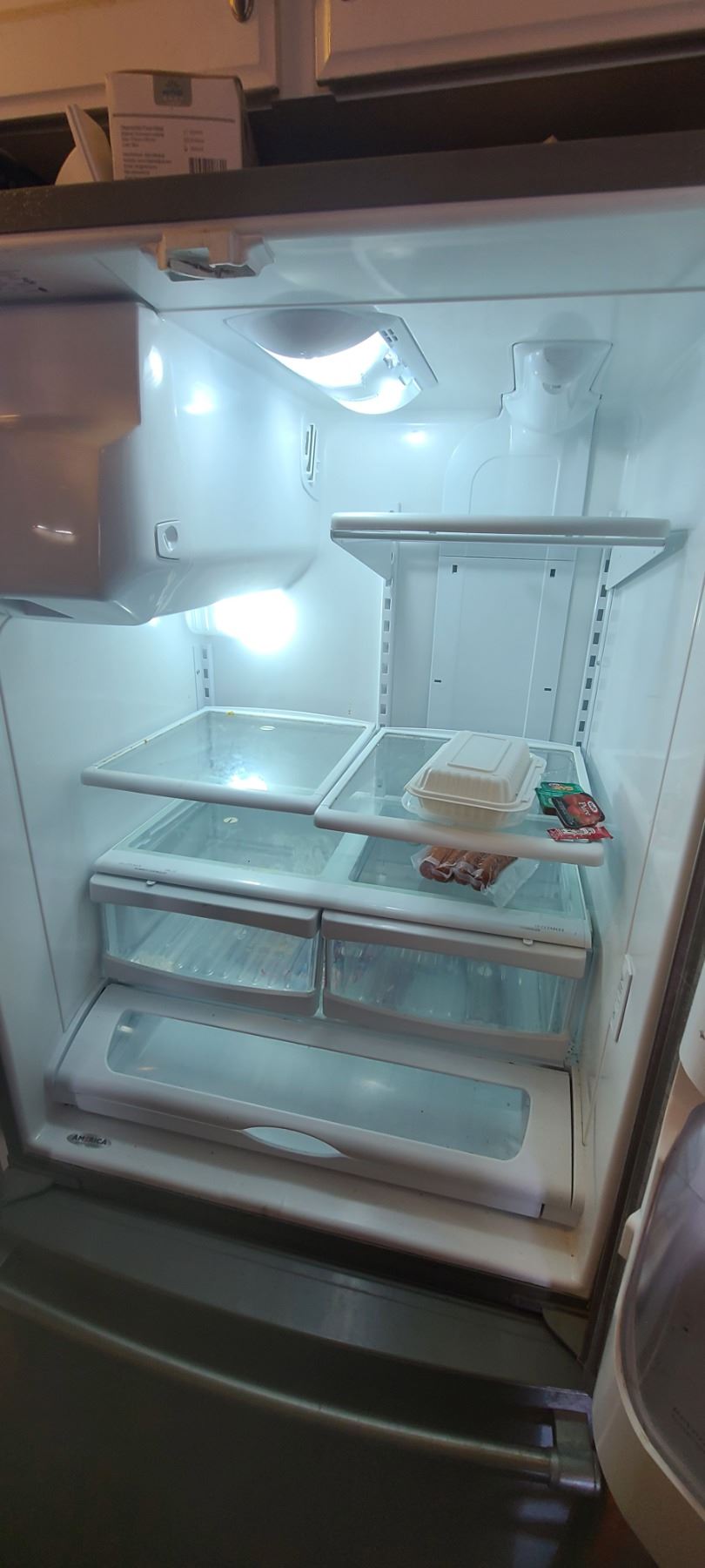 MAYTAG UPRIGHT STAINLESS STEEL TWO DOOR REFRIDGERATOR, ICE MAKER - COMES WITH CONTENTS