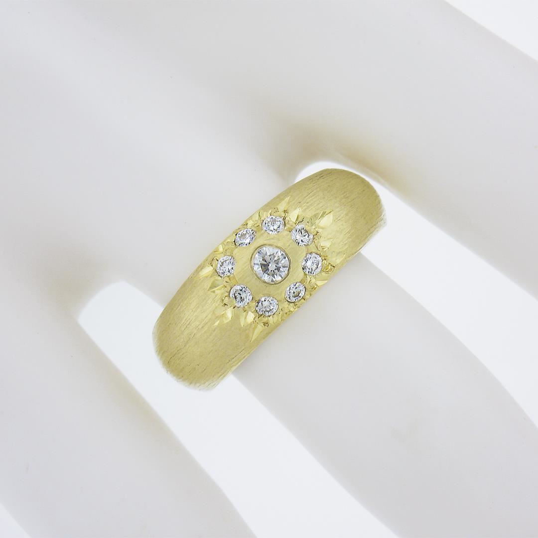 A solid 14k yellow gold cluster band by MAZ, featuring 10 round cut natural diamonds (F/G - VS1/VS2 ; 0.27ctw). The ring is size 6.0, weighs a total of 6.88 grams, and measures 7.5mm wide.