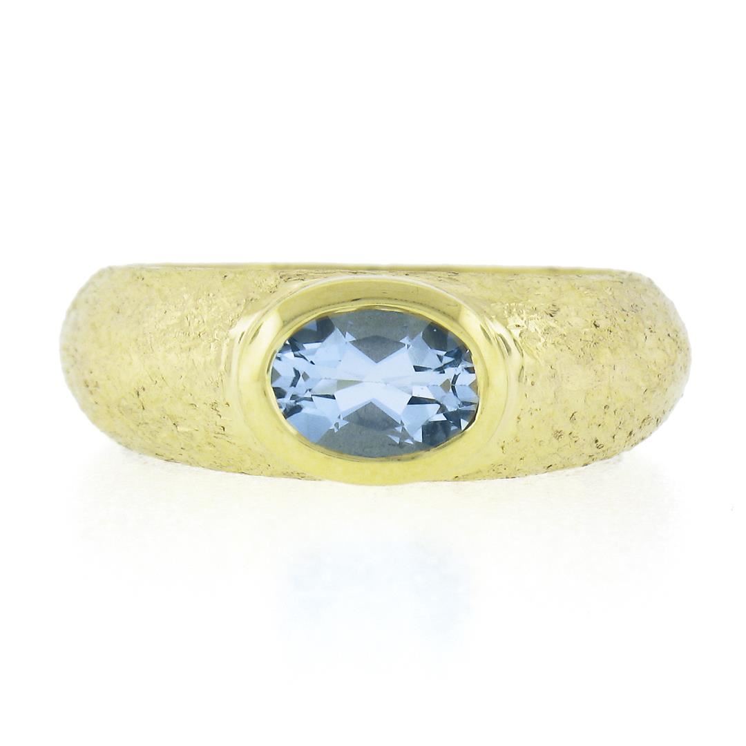 A solid 14k yellow gold solitaire band ring, with 1 oval cut natural aquamarine (0.70ct). The ring is size 6.5, weighs a total of 5.65 grams, and measures 6.9mm wide.