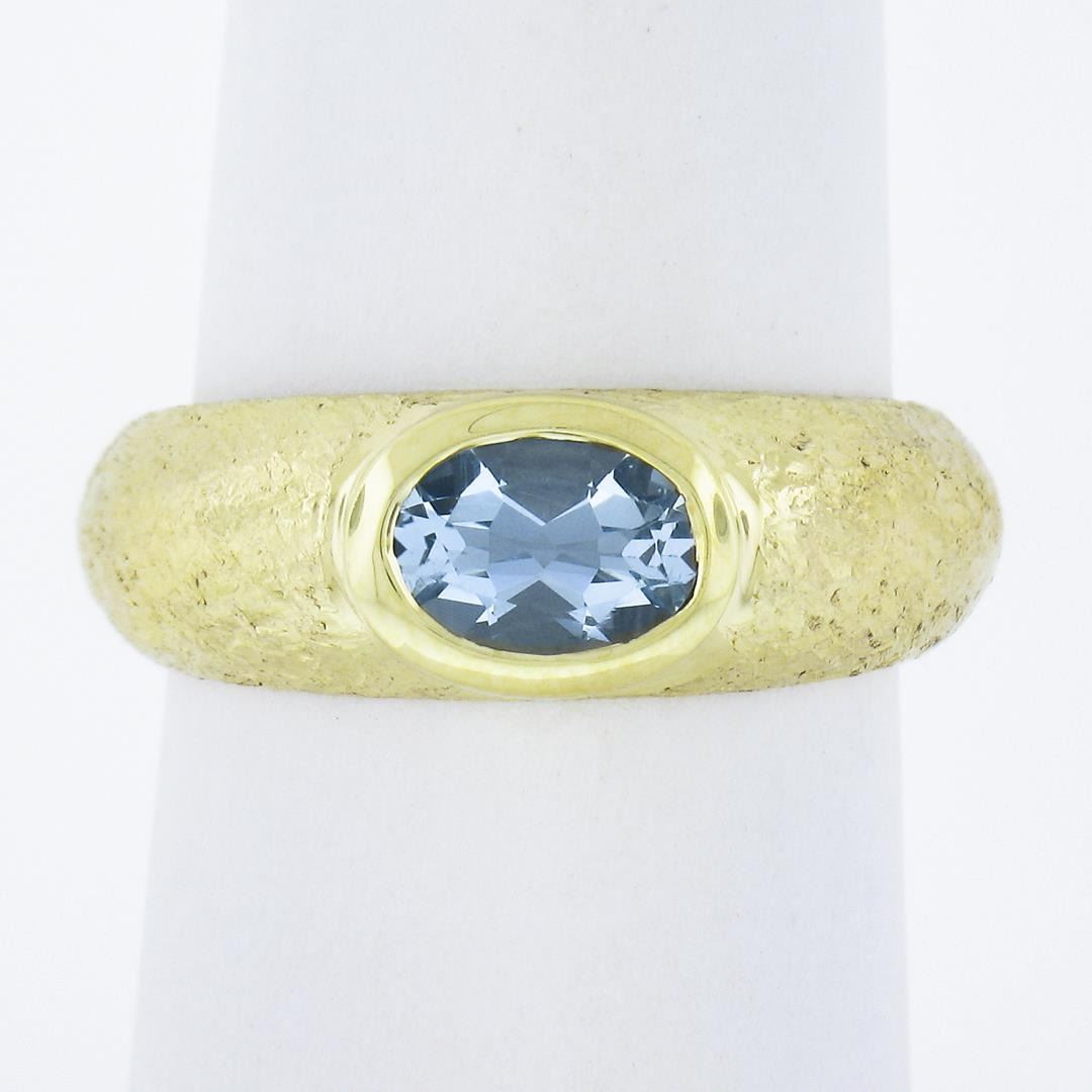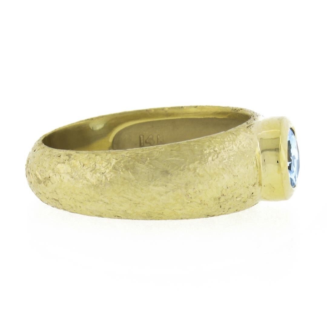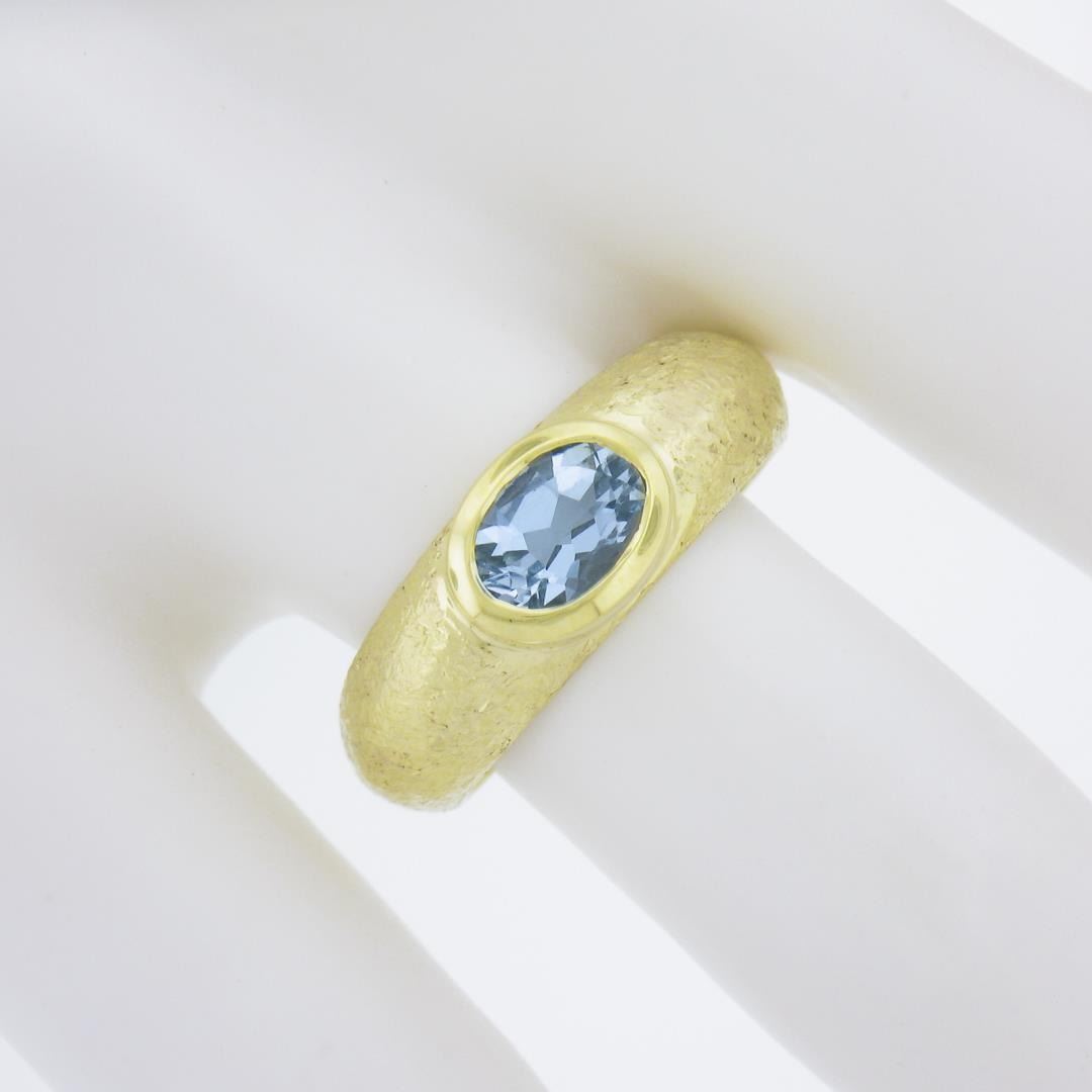 A solid 14k yellow gold solitaire band ring, with 1 oval cut natural aquamarine (0.70ct). The ring is size 6.5, weighs a total of 5.65 grams, and measures 6.9mm wide.