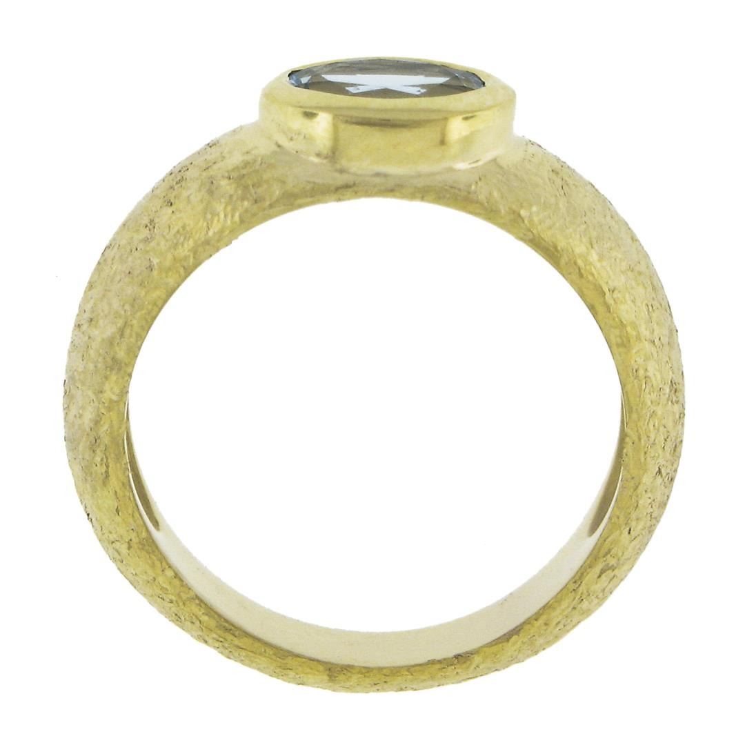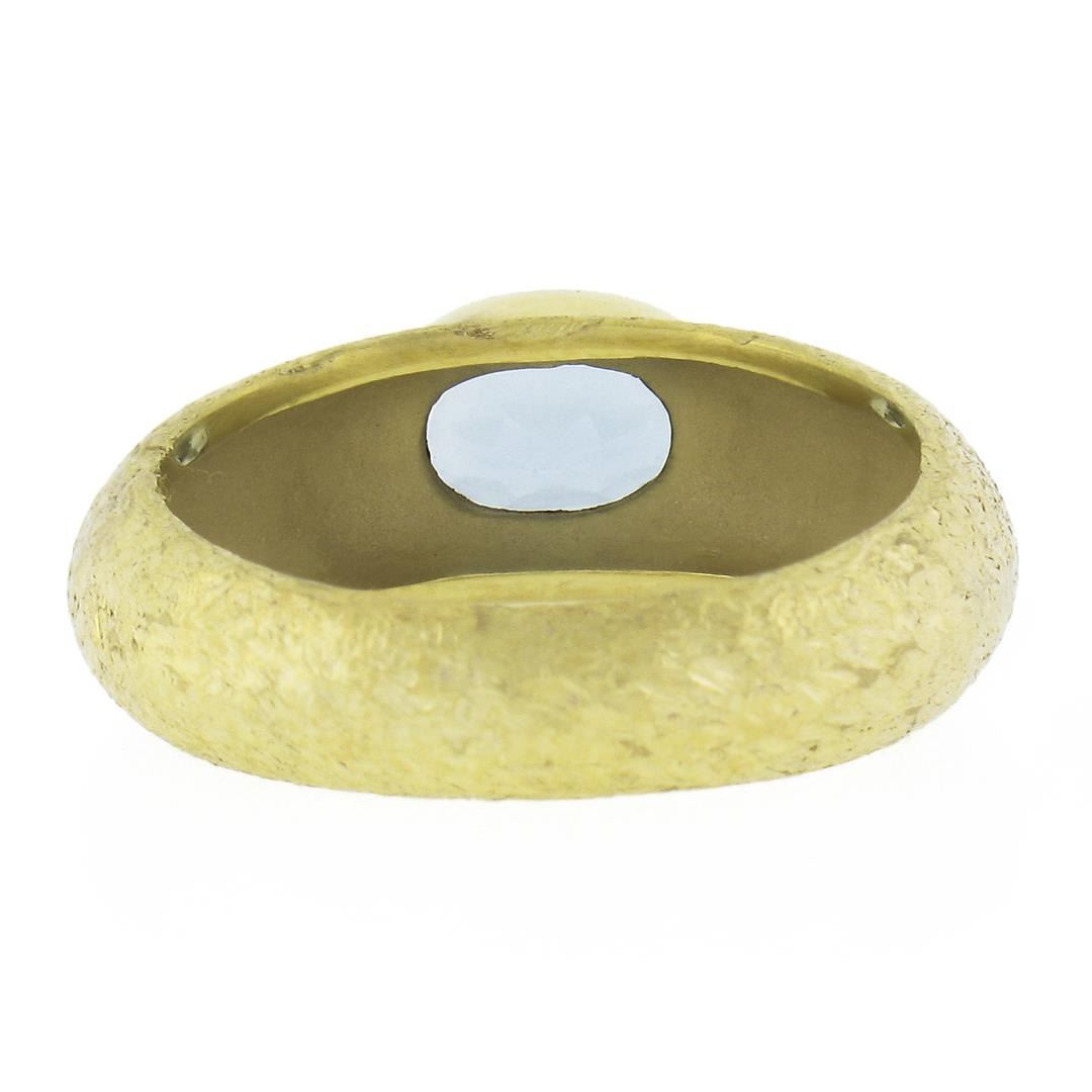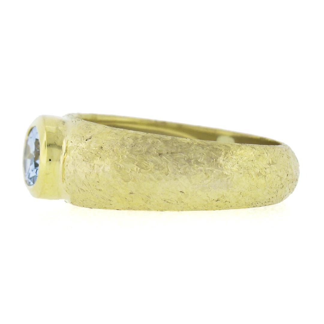 A solid 14k yellow gold solitaire band ring, with 1 oval cut natural aquamarine (0.70ct). The ring is size 6.5, weighs a total of 5.65 grams, and measures 6.9mm wide.