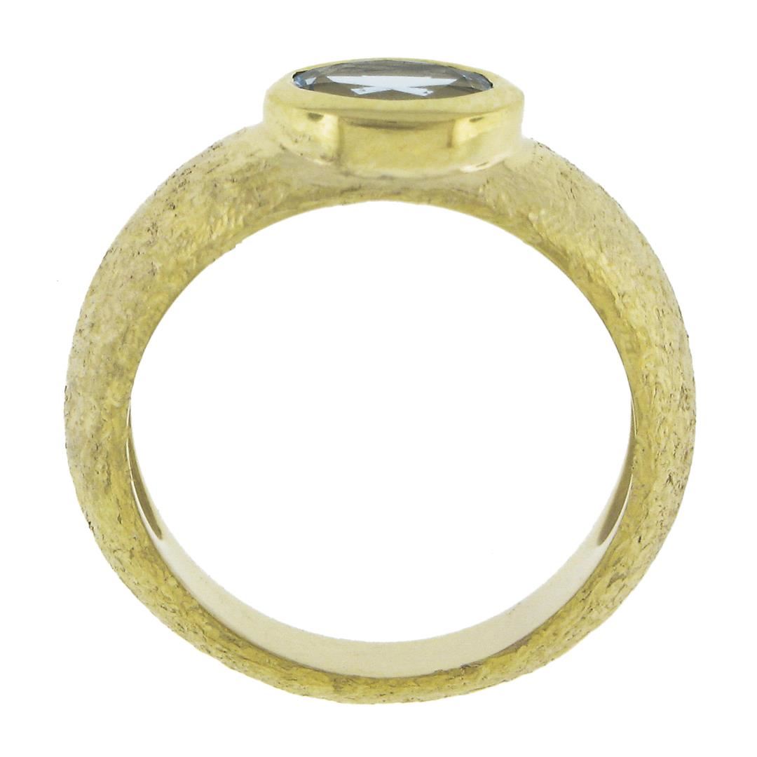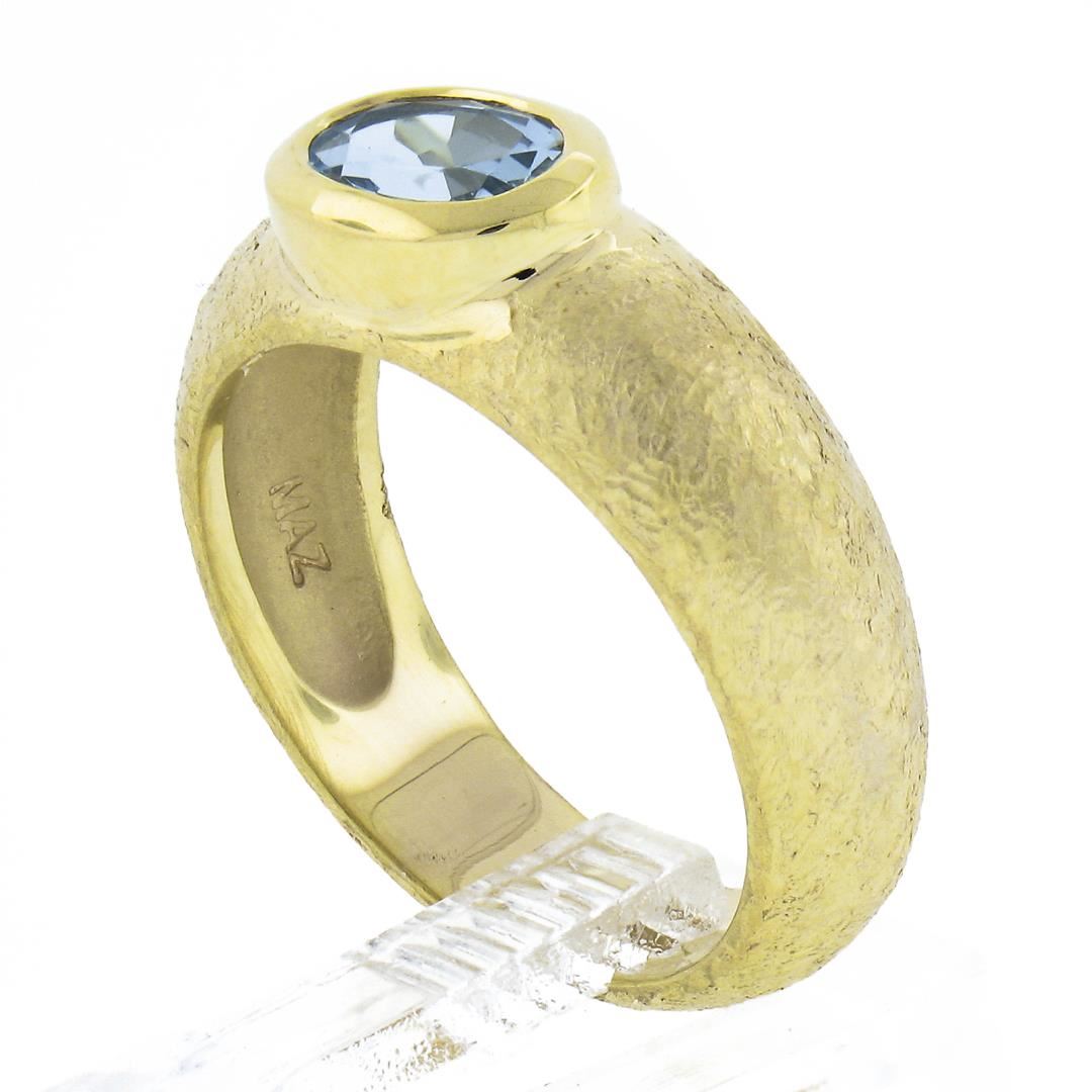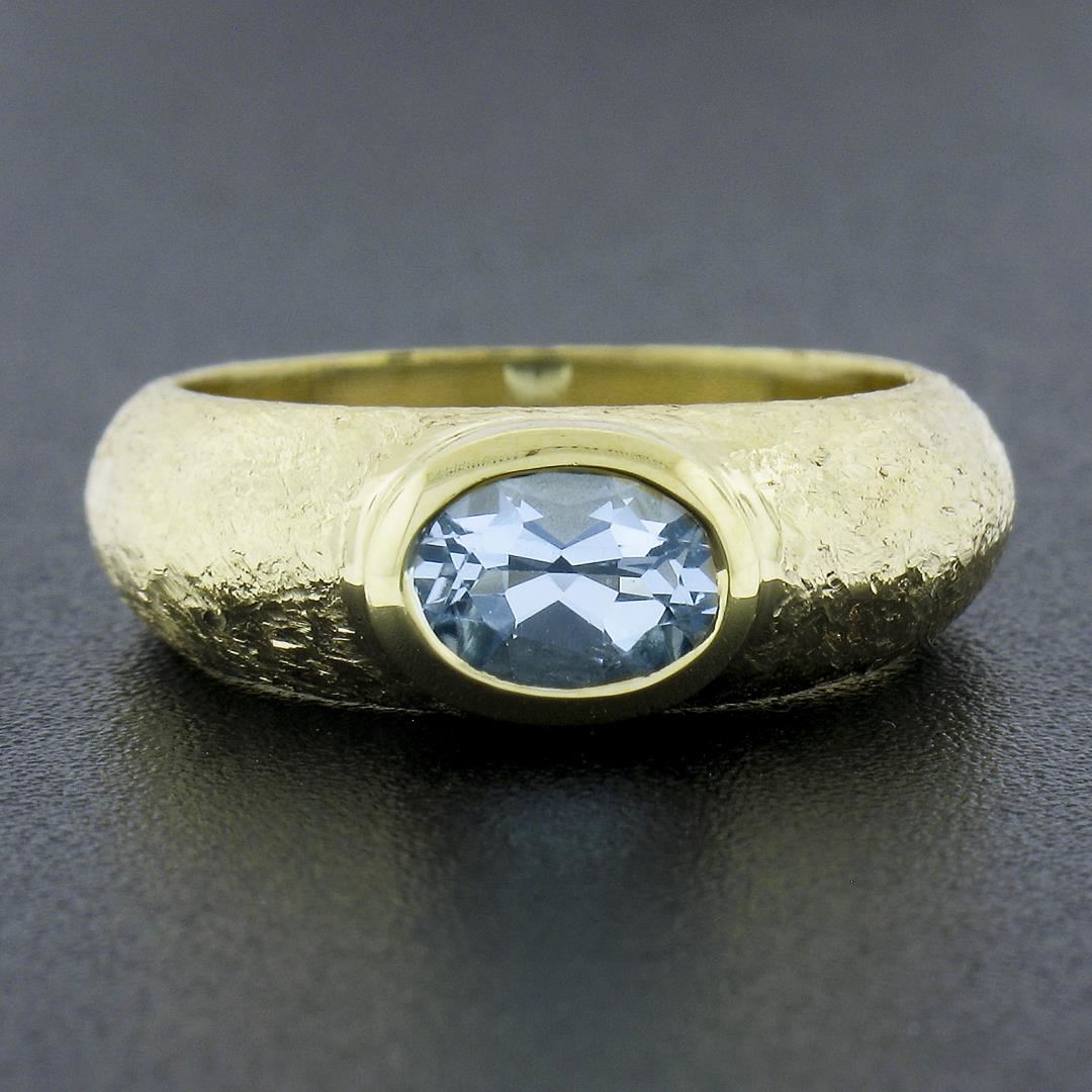 A solid 14k yellow gold solitaire band ring, with 1 oval cut natural aquamarine (0.70ct). The ring is size 6.5, weighs a total of 5.65 grams, and measures 6.9mm wide.