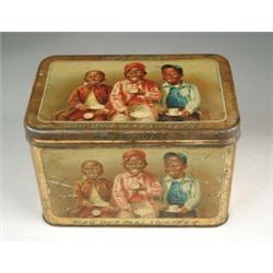 MAZAWATTEE TEA TIN. English three pound tin with five lithographed panels depicting black children who appear to have oriental-rendered eyes. SIZE: 8 1/2” w. x 5 3/4” h. x 5 1/2” d. CONDITION: Good with scattered scrapes, scuffs, and scratches. PF 1-3478 (200-400)