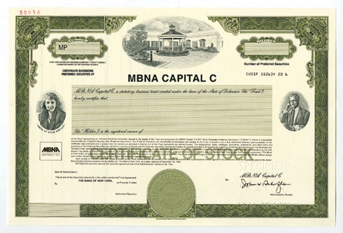 MBNA Capital C, 1997 Odd Shrs Specimen Stock Cert., VF-XF ABN Olive Green. MBNA Corporation was a bank holding company and parent company of wholly owned subsidiary MBNA America Bank, N.A., headquartered in Wilmington, Delaware, prior to being acquired by Bank of America in 2006.