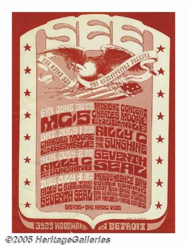 <B>MC5 See Handbill, Detroit (1967).</B></I> The MC5 play a midnight concert at the See in Detroit; other shows listed include Billy and the Sunshine, the Charles Moore Ensemble, and Seventh Seal, plus a July 4th poetry reading featuring John Sinclair. Gary Grimshaw provides the patriotic graphics, printed in red. Size is 8" x 10.5". Some very light soiling, minor wrinkles and two tiny tears along the bottom edge. VG.