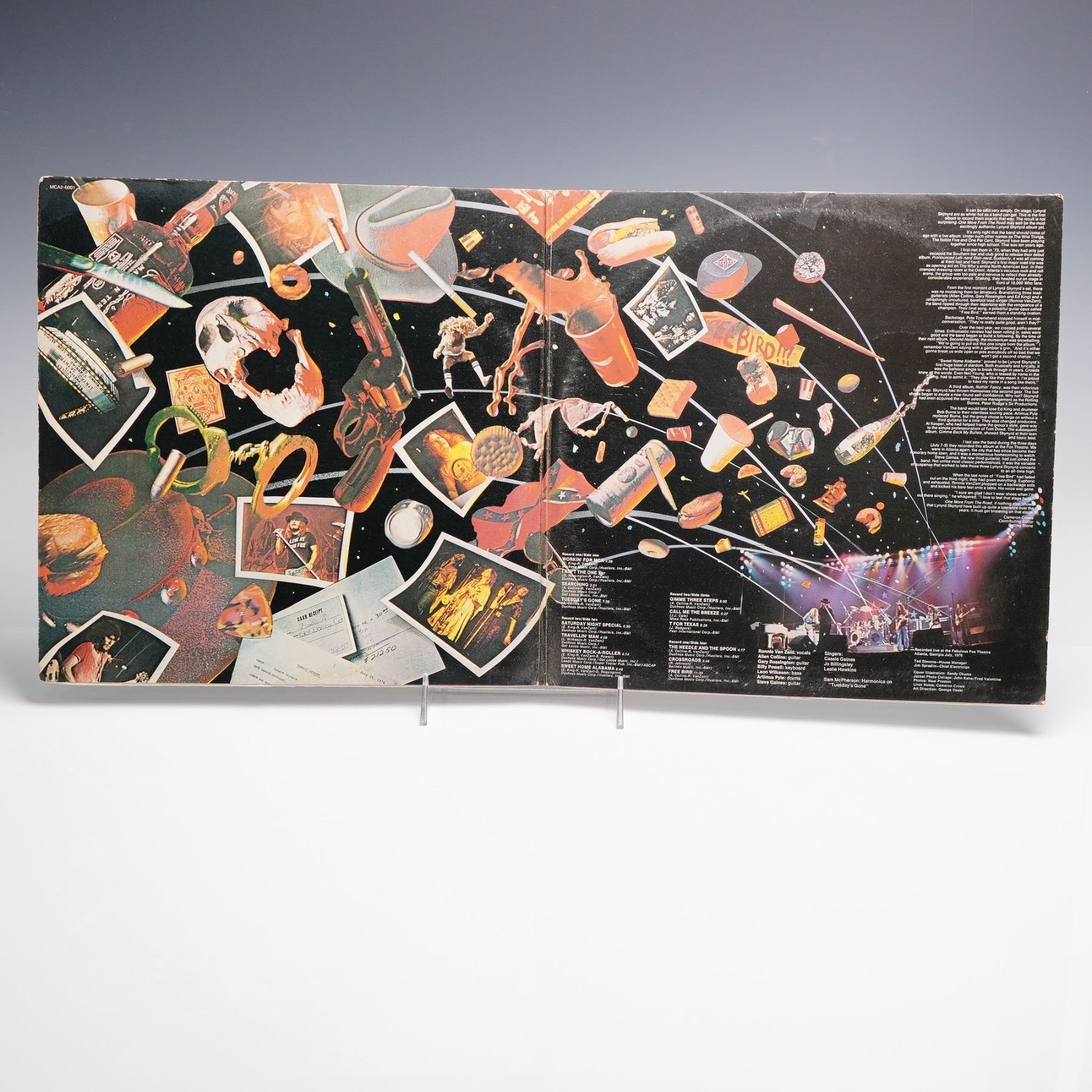 This double 12-inch vinyl gatefold LP features One More from the Road, the 1976 live album by Southern rock band Lynyrd Skynyrd, released under MCA Records. The album captures a dynamic series of performances recorded at the Fox Theatre in Atlanta, Georgia, and includes extended live renditions of classics such as "Free Bird," "Sweet Home Alabama," "Saturday Night Special," "Gimme Three Steps," and "Call Me the Breeze," among others. The set spans four sides and contains a total of 14 tracks, performed with raw energy and characteristic stage presence. The front cover depicts a theatrical stage opening onto a winding green highway that leads to a live concert scene, while the gatefold interior showcases a vivid space themed collage interspersed with memorabilia, photographs, and lyrics. The reverse continues the stage-to-road visual motif, with an image of the empty stage and equipment setup. The records are labeled with the signature MCA rainbow labels.