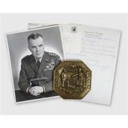 (1898 - 1975) American Army general who held Bastogne during the Battle of the Bulge, remembered for his reply to a German surrender ultimatum, ""Nuts!"" A fine grouping of items, including: fine content T.L.S. on his personal letterhead, 1p. 8vo., Washington, Apr. 22, [1966], to Joseph Filipps, in full: ""''Nuts' is the word I used immediately when I learned that the Germans were demanding surrender"". Along with a fine vintage S.P. 8"" x 10"" b/w, mounted, a handsome chest, up portrait in uniform, boldly signed across the face in white pen; and a handsome relic, a highly detailed octagonal brass commemorative Airborne plaque, measuring 5 1/2"" x 5 1/2"", honoring the Allied taking of Bastogne and McAuliffe's famous defiance. It shows a Nazi officer presenting the surrender terms to an American officer, portrayed in high relief against the backdrop of the town of Bastogne with American parachutes dropping to the ground. McAuliffe's legendary declaration ""Nuts"" is shown above the date Decber 44"". A fine grouping of items, in very good condition.