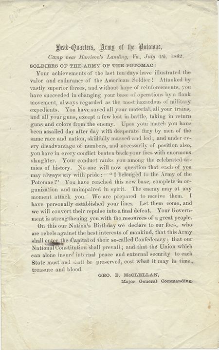 Field-printed document, 1p. 8vo., "Camp near Harrison's Landing, Va.", July 4, 1862, in which Gen. George McClellan congratulates the troops of the Army of the Potomac for: "...taking the colors of the enemy...you have in every conflict beaten back your foes with enormous slaughter...Let them come and we will convert their repulse into final defeat...this Army shall enter the capital of their so-called Confederacy...the Union...must and shall be preserved, cost what it may in time, treasure and blood...". Sold with a scarce CDV image of McClellan regarding a photo album while seated and in uniform, backstamp by J. W. Black, Boston. Two pieces, very good.
