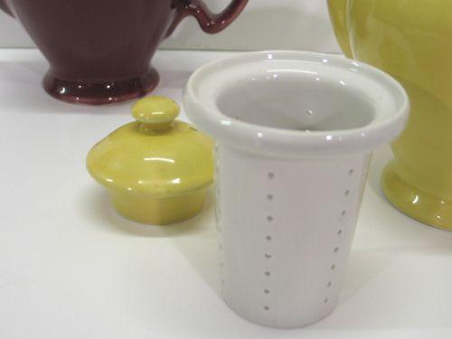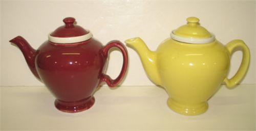 PAIR OF MCCORMICK POTTERY TEAPOTS WITH INSERTS. Both are marked on bottom “McCormick Tea-Baltimore, Md.-Made in U.S.A.” Consists of one lavender teapot and one yellow teapot. Both measure 7” H.
