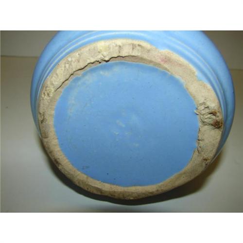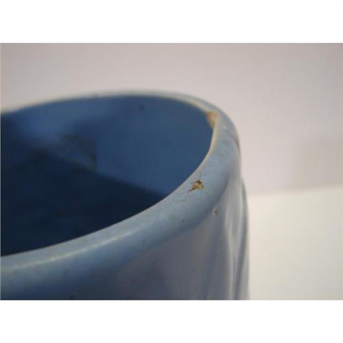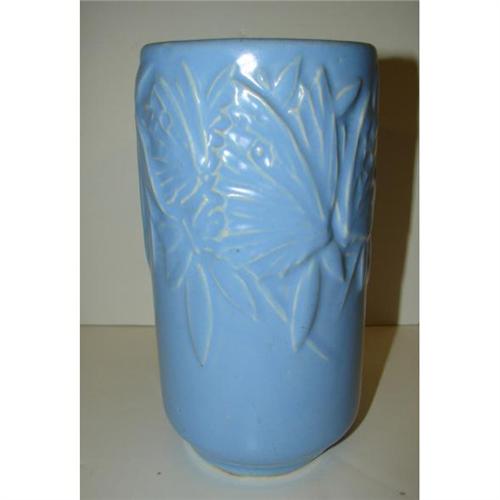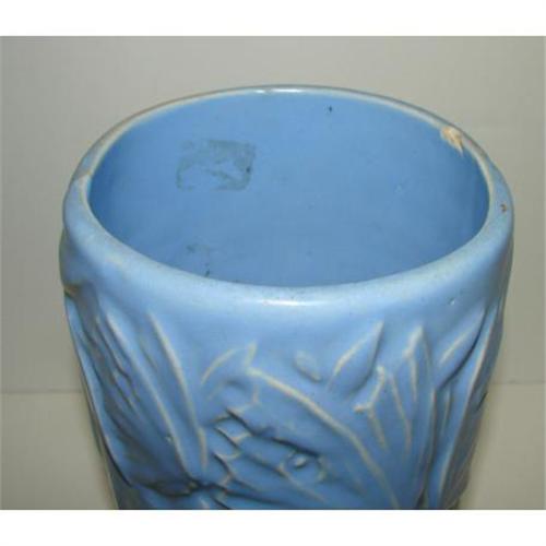 MCCOY POTTERY CYLINDER FORM VASE. Circa 1940. Light blue glaze with a relief leaf decoration around top of body. Marked on bottom. Shows one chip along inner portion of top rim with one tight hairline crack on top rim. 8” H