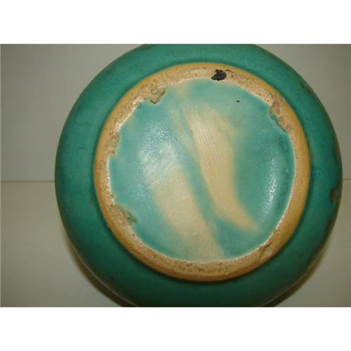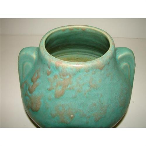 MCCOY POTTERY DOUBLE HANDLED SQUAT VASE. Green glaze with brown drip glaze. No mark. 4.5” H