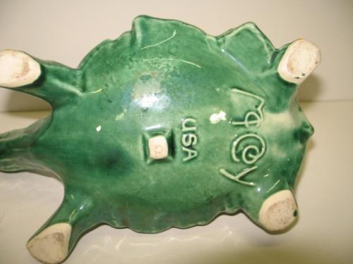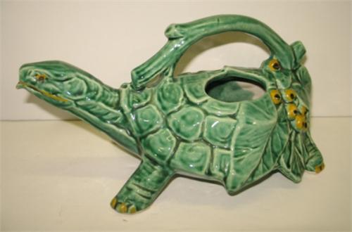 MCCOY FIGURAL WATERING POT. In figural form of turtle with branch form handle. Shows signs of crazing throughout. Marked on bottom. 5” H, 10” L