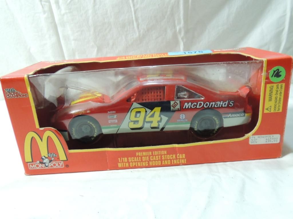 MCDONALDS MONOPOLY 1/18 SCALE DIE CAST STOCK CAR WITH OPENING HOOD AND ENGINE. PREMIER EDITION. COLLECTIBLE. AS SHOWN SEE PHOTO FOR MORE DETAILS.