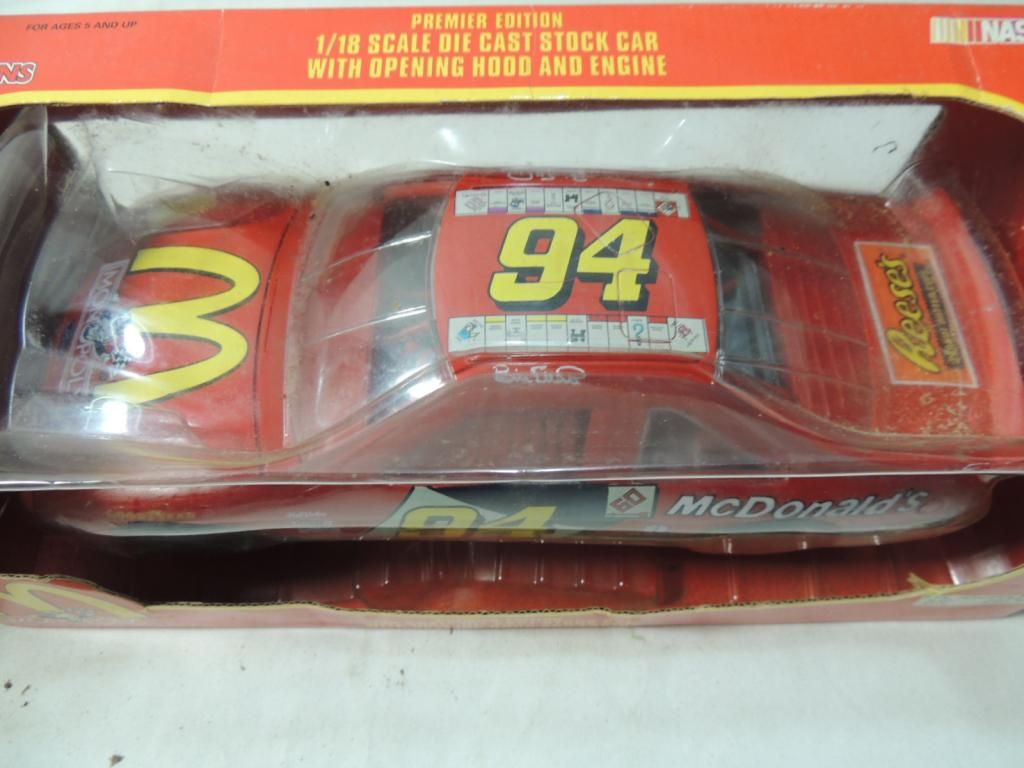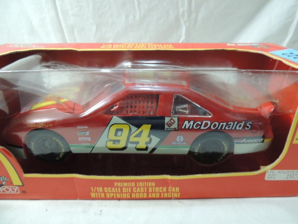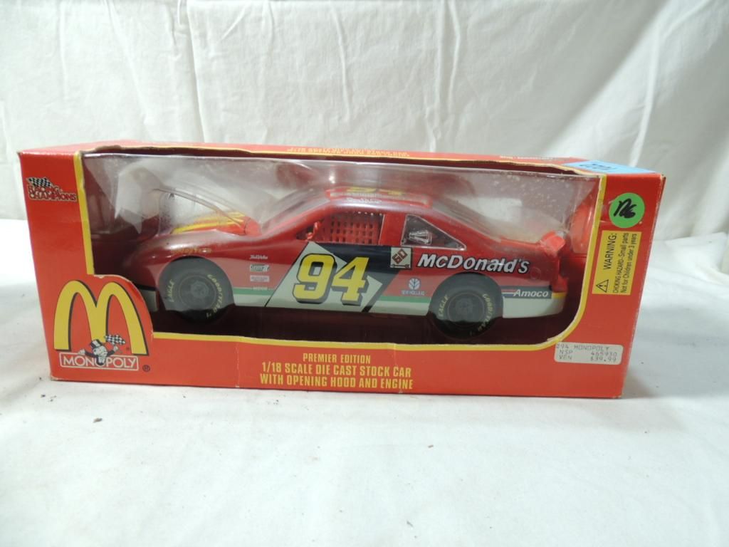 MCDONALDS MONOPOLY 1/18 SCALE DIE CAST STOCK CAR WITH OPENING HOOD AND ENGINE. PREMIER EDITION. COLLECTIBLE. AS SHOWN SEE PHOTO FOR MORE DETAILS.