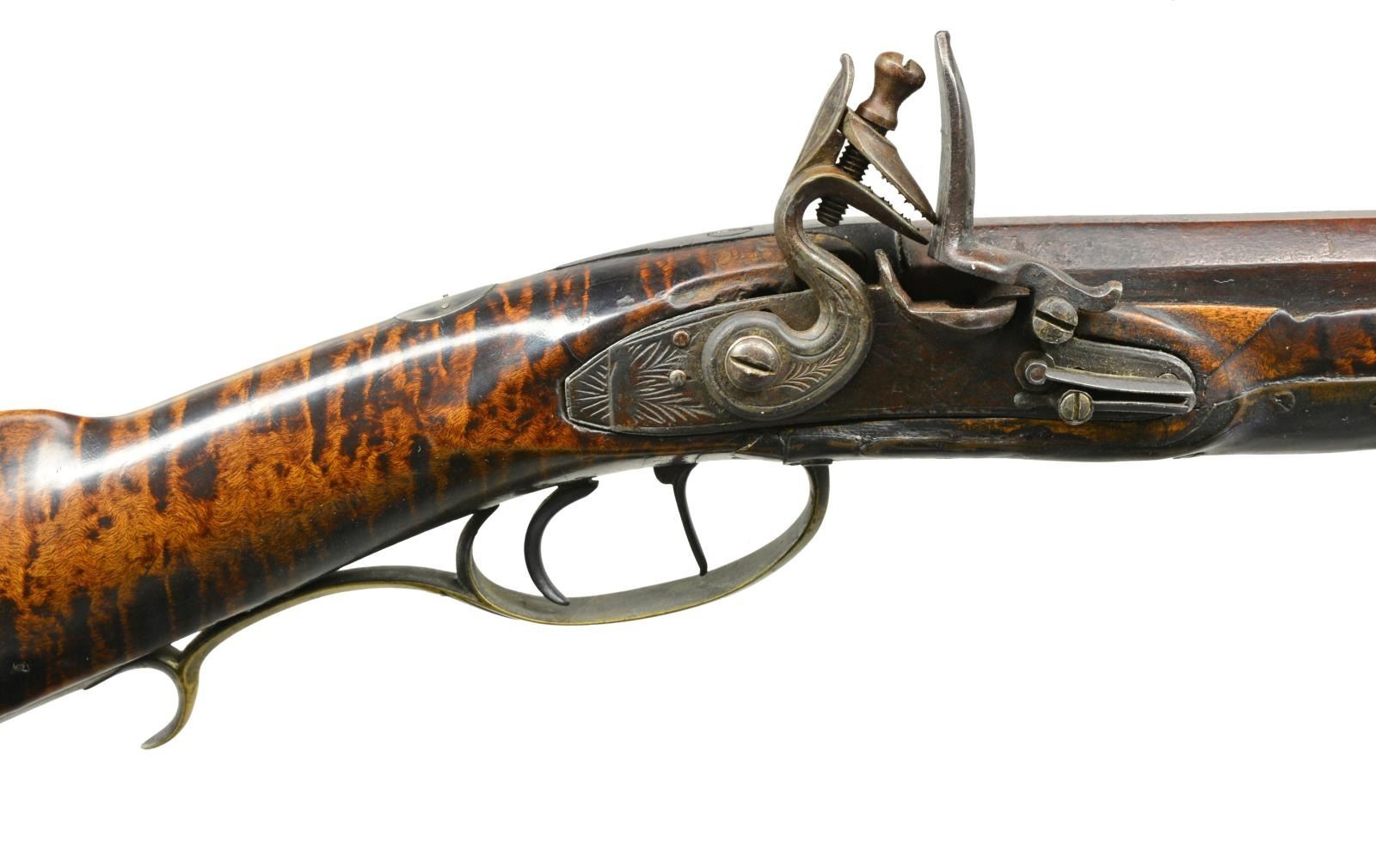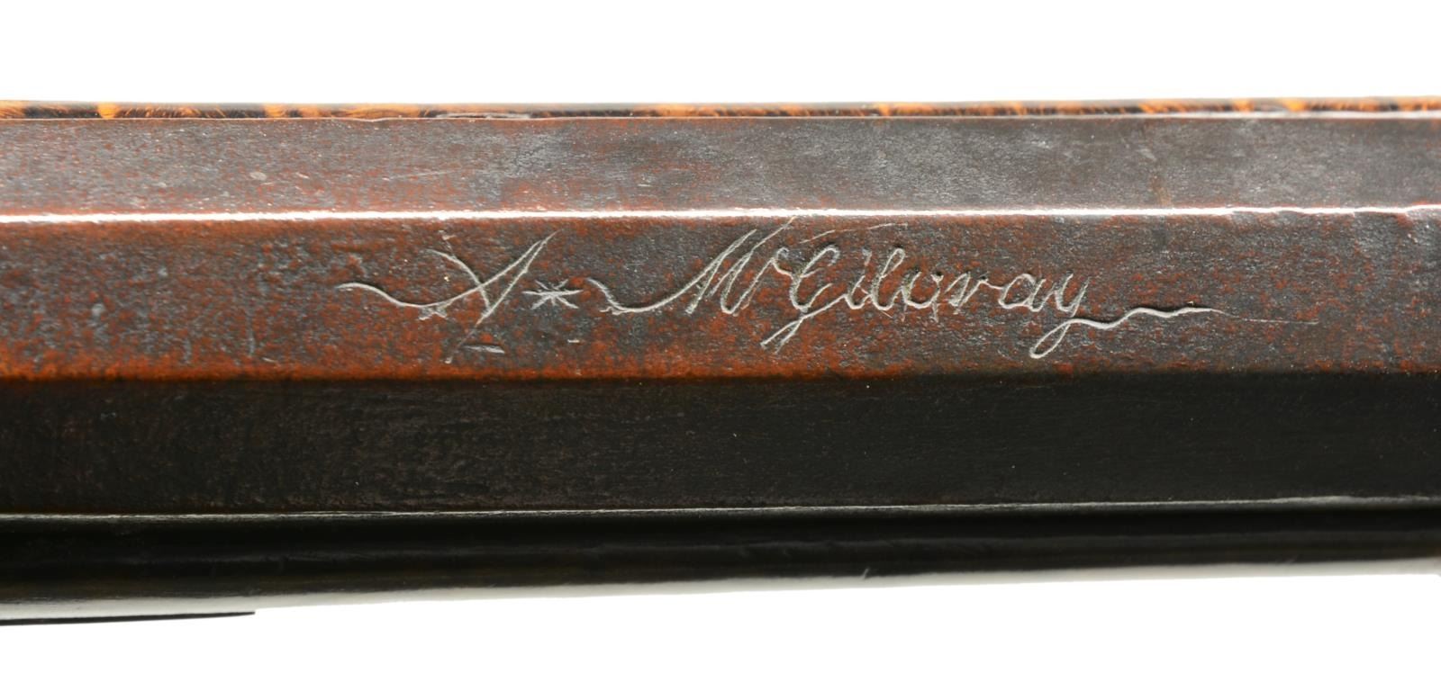 RIFLE. Cal. ???. NSN. 61 3/4" Overall. Bbl. 45" oct. w/ silver front blade sight, fixed iron rear sight signed in script “A McGILVRAY”. Alexander McGilvray worked in Harrisburg, Virginia 1820-1825. This is an attractive example, brass mounted, w/ silver hunting star in cheekpiece & void silver oval thumbplate, 8 keyway escutcheons are also silver, 4 piece pierced & engraved patch box. There is a clever well executed 5" x 2 1/2" sheet copper & screw repair to stock forward of trigger guard that is heavily patinaed today. CONDITION: very good overall, appears to be original flint, though cock & frizzen spring are replaced. Lock & bbl. have dark iron patina, brass has medium mustard patina, copper sheeting repair has olive/chocolate colored patina. Stock has hand worn patina retaining some of its original dark finish in protected areas. PROVENANCE: Eagle Museum, Strasburg Pennsylvania. From the Collection of John "Tim" Breth Jr. (01-17782/JS). ANTIQUE. $2,000-3,000.