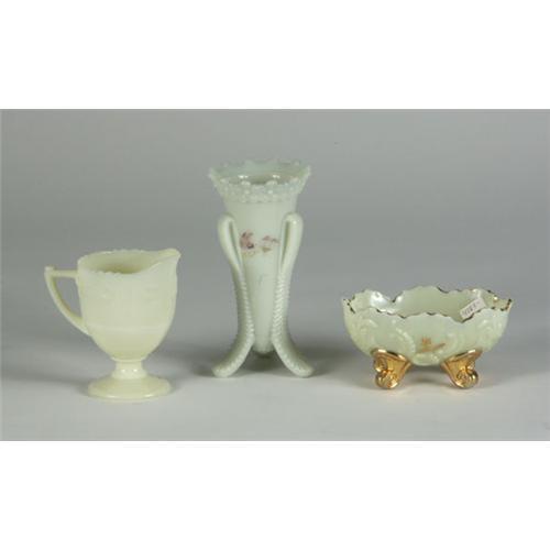 Three items pale yellow custard glass to include tripod vase, 6.5'' H, no chips, molding imperfections, painting faded; footed half-egg form dish with worn gilding, 5'' L x 2.5'' H; McKee creamer, fleabites at base, 4'' H.