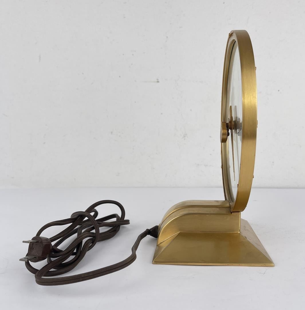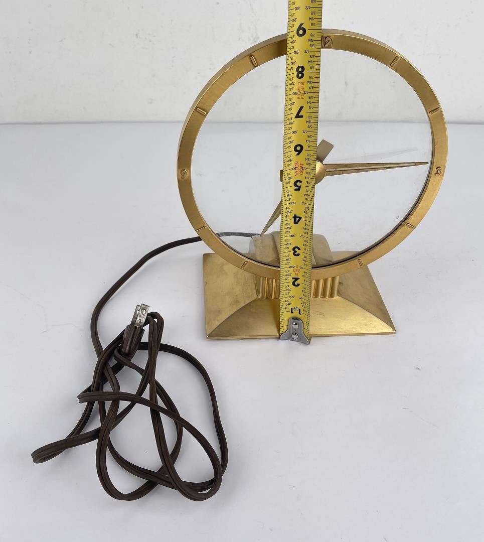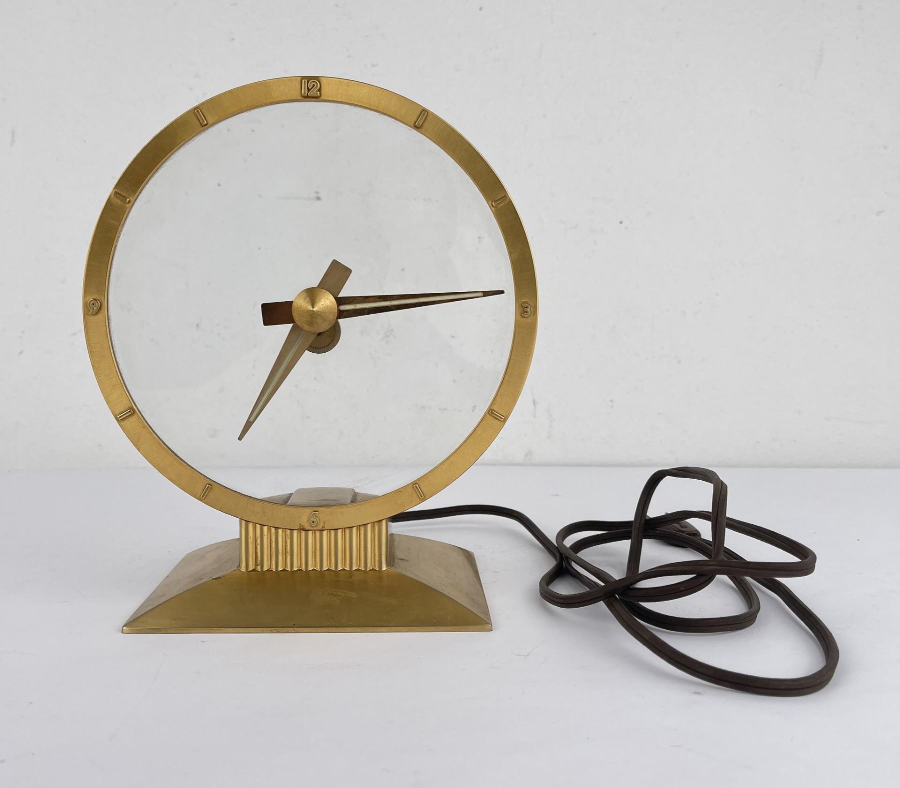 Mid Century desk/mantle clock. Currently not operational. The "Golden Hour" clock made by the Jefferson Electric Company of Bellwood, IL in the mid-1950's is the most often seen of the various mystery clocks and certainly one of the best looking. The single glass disk has a toothed metal rim that is driven by a motor in the base. The minute hand rotates with this disk. A gear train drives the hour hand. Crucial to making this system to work without a separate, immobile mount for the gear train is a small weight behind the glass. When new, this system worked well, but with wear and dirt the weight tends to follow the minute hand around until friction is overcome, and the hour hand will jump around wildly, and lose or gain hours, as it sees fit. Golden Hour clocks used radioactive radium paint on the hands and numerals.