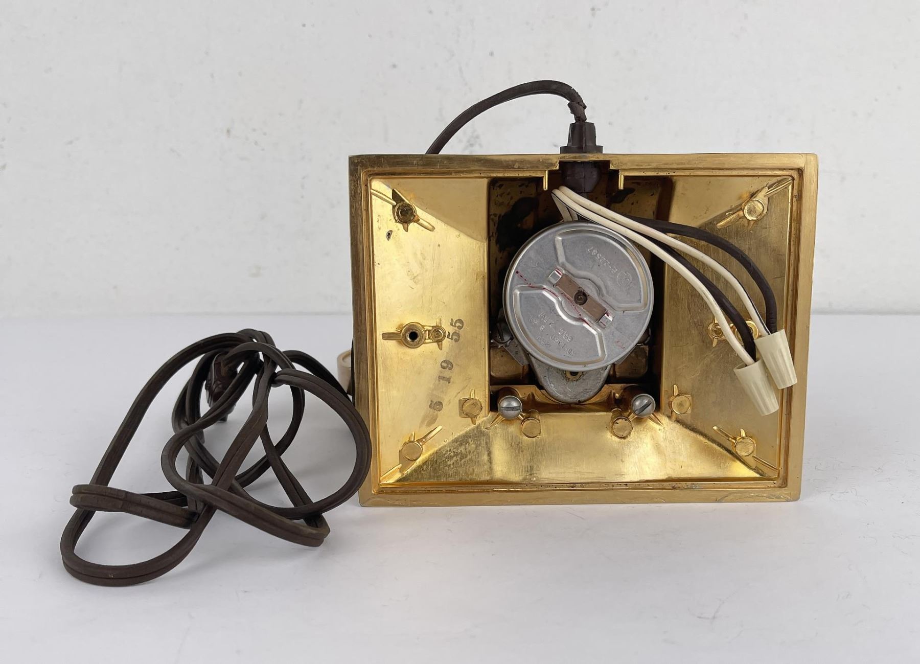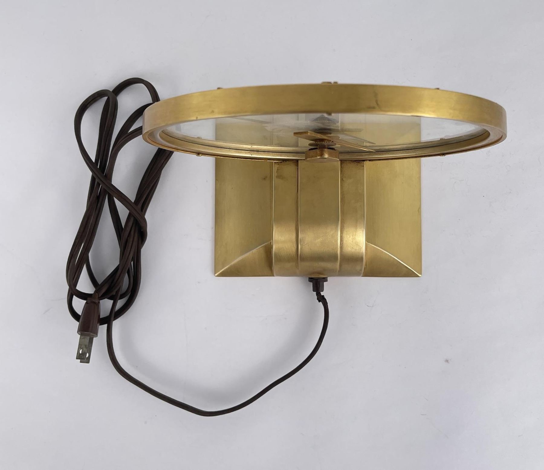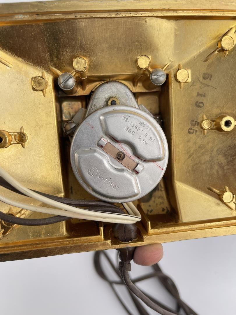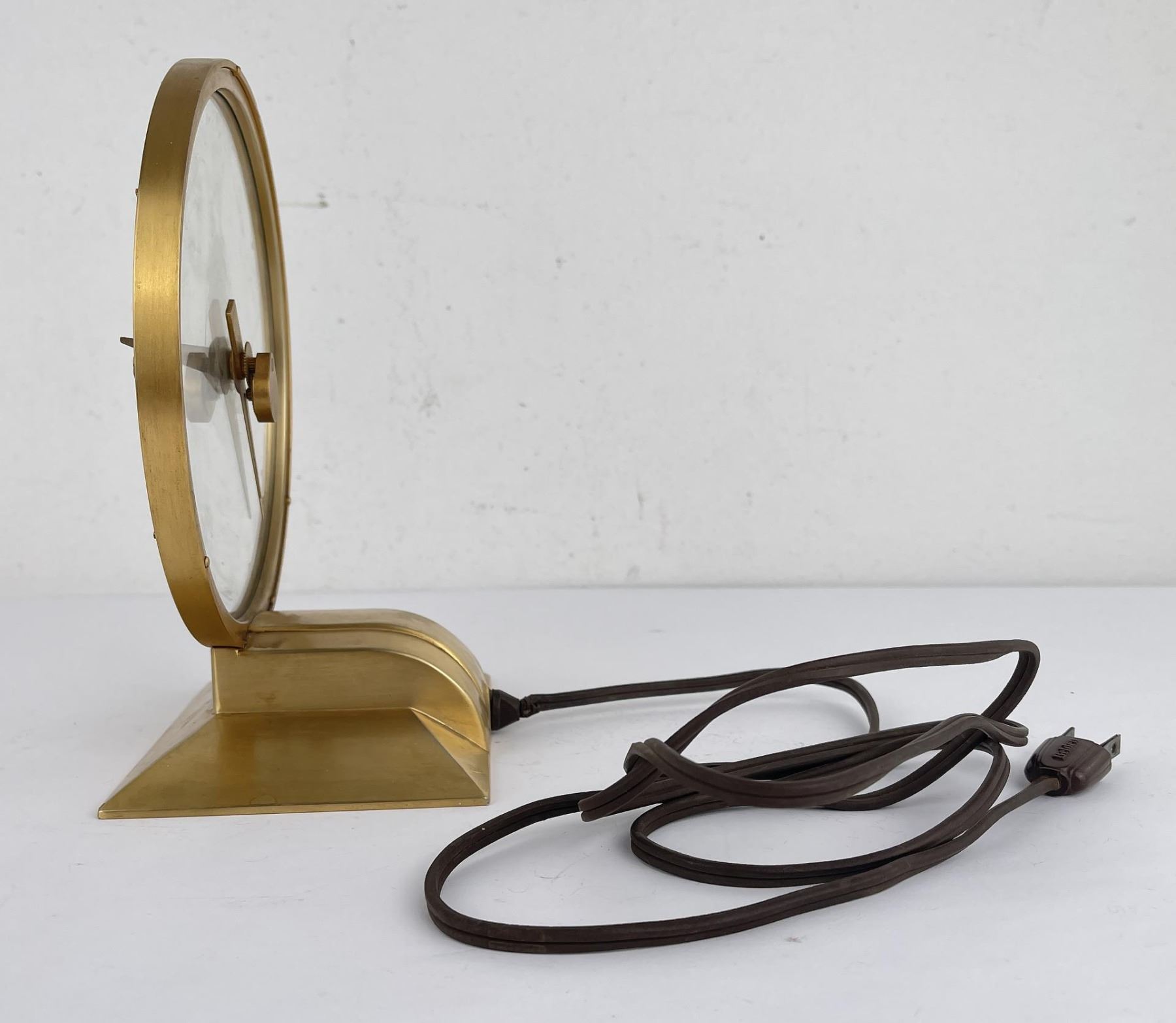 Mid Century desk/mantle clock. Currently not operational. The "Golden Hour" clock made by the Jefferson Electric Company of Bellwood, IL in the mid-1950's is the most often seen of the various mystery clocks and certainly one of the best looking. The single glass disk has a toothed metal rim that is driven by a motor in the base. The minute hand rotates with this disk. A gear train drives the hour hand. Crucial to making this system to work without a separate, immobile mount for the gear train is a small weight behind the glass. When new, this system worked well, but with wear and dirt the weight tends to follow the minute hand around until friction is overcome, and the hour hand will jump around wildly, and lose or gain hours, as it sees fit. Golden Hour clocks used radioactive radium paint on the hands and numerals.