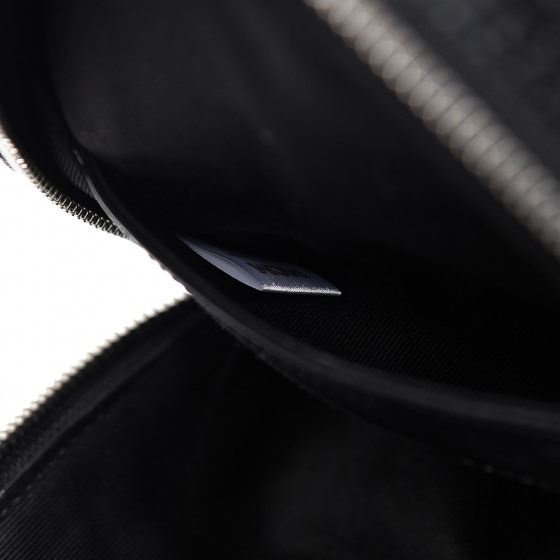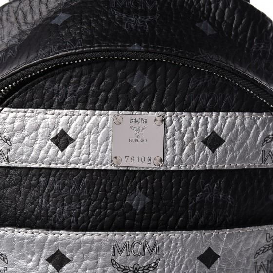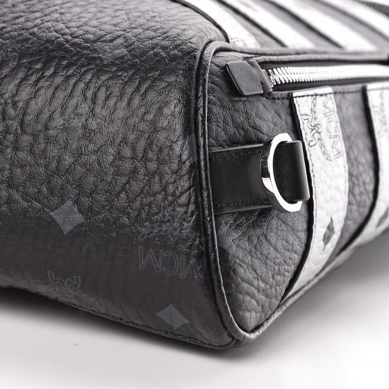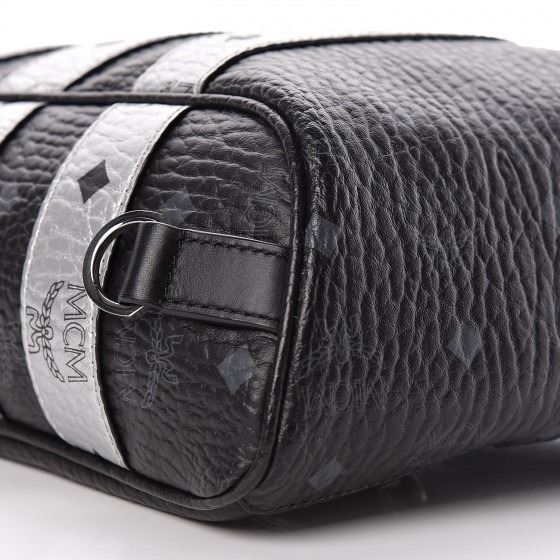 Crafted of textured black and silver Visetos coated canvas with MCM logo print. The bag features polished silver hardware, an adjustable black nylon shoulder strap, and a vertical zipper pocket. The wrap-around zippers open to a black fabric interior with a patch pocket.