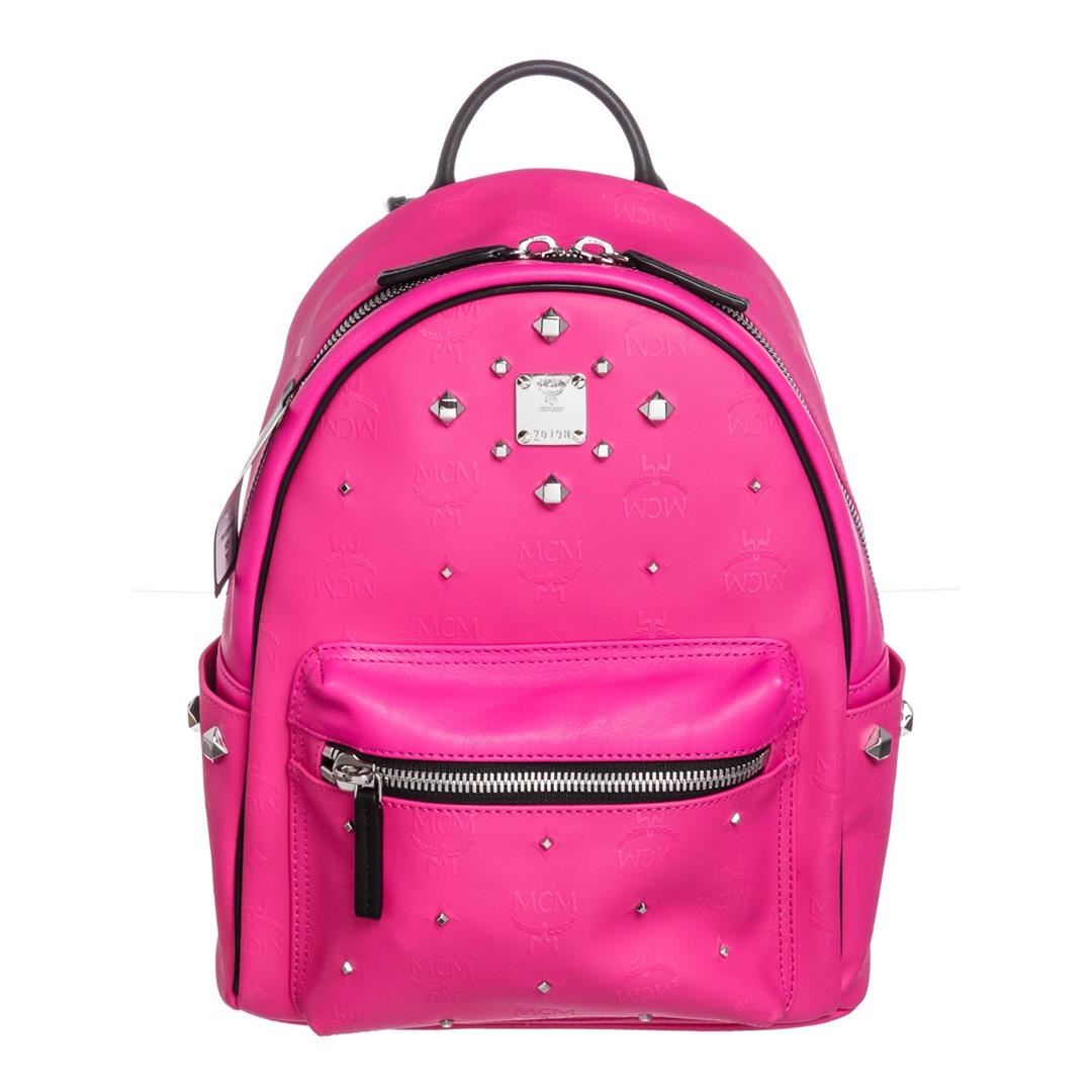 Beet root pink coated canvas MCM small Stark Odeon backpack with silver-tone hardware, dual flat shoulder straps, single rolled top handle, black leather trim, three exterior pockets; one with zip closure, stud accents at exterior, black suede lining, dual slit pockets at interior wall and zip closure at top. Authentic.