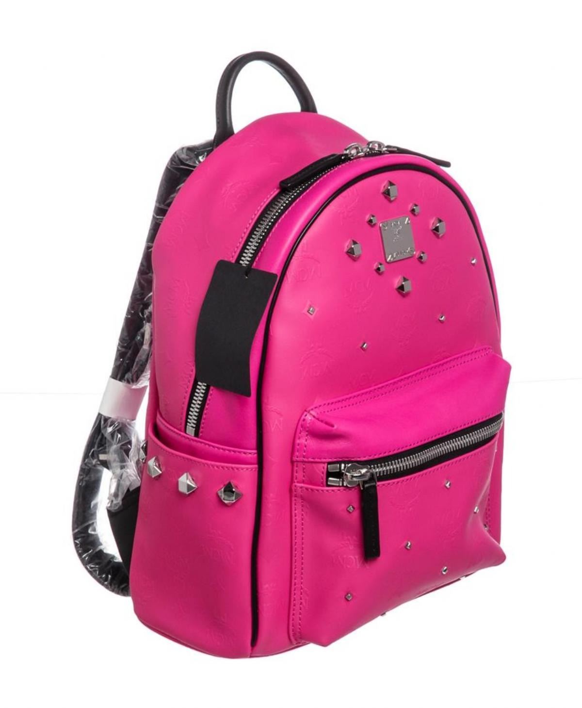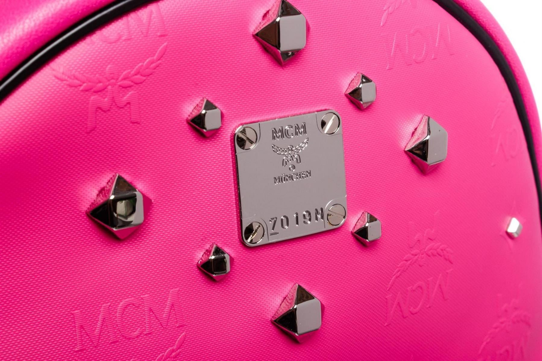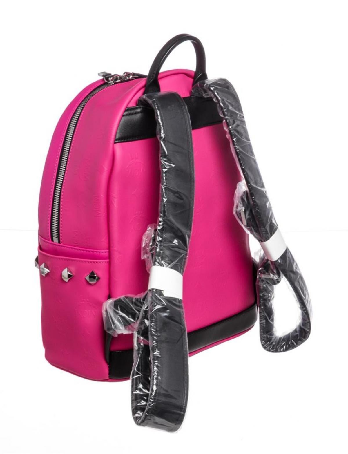 One MCM Beet Root Pink Small Coated Canvas Stark Odeon Backpack. Beet root pink coated canvas MCM small Stark Odeon backpack with silver-tone hardware, dual flat shoulder straps, single rolled top handle, black leather trim, three exterior pockets; one with zip closure, stud accents at exterior, black suede lining, dual slit pockets at interior wall and zip closure at top.