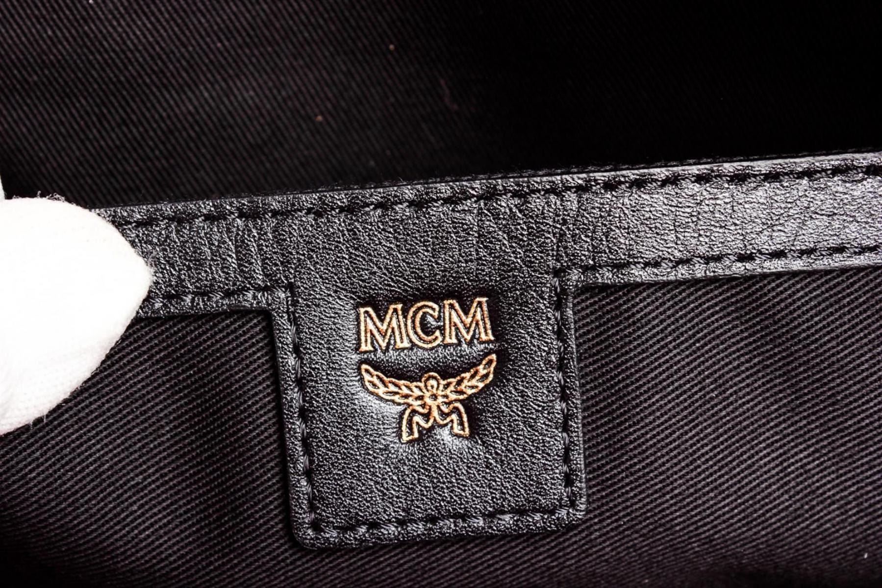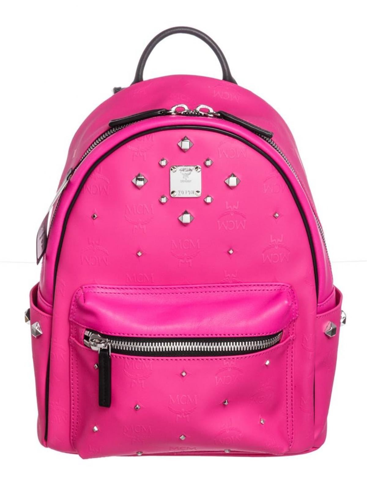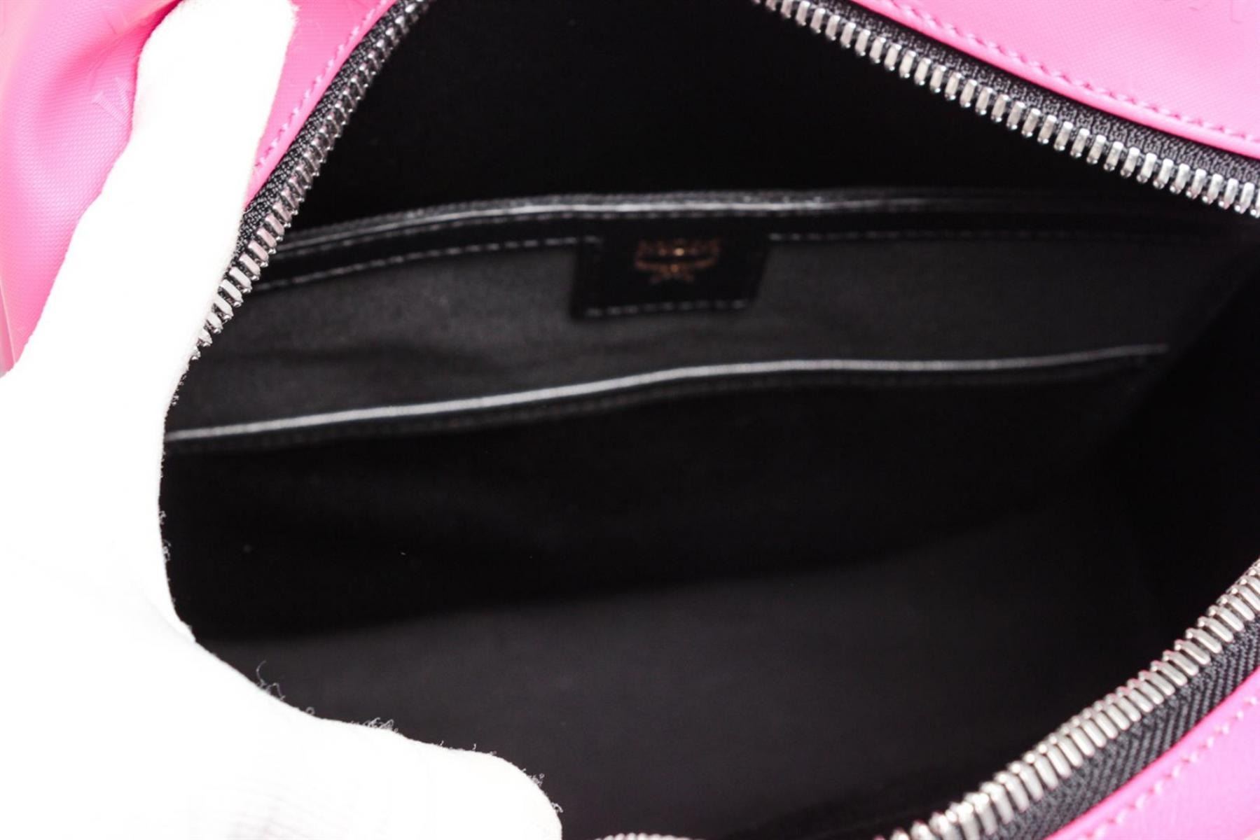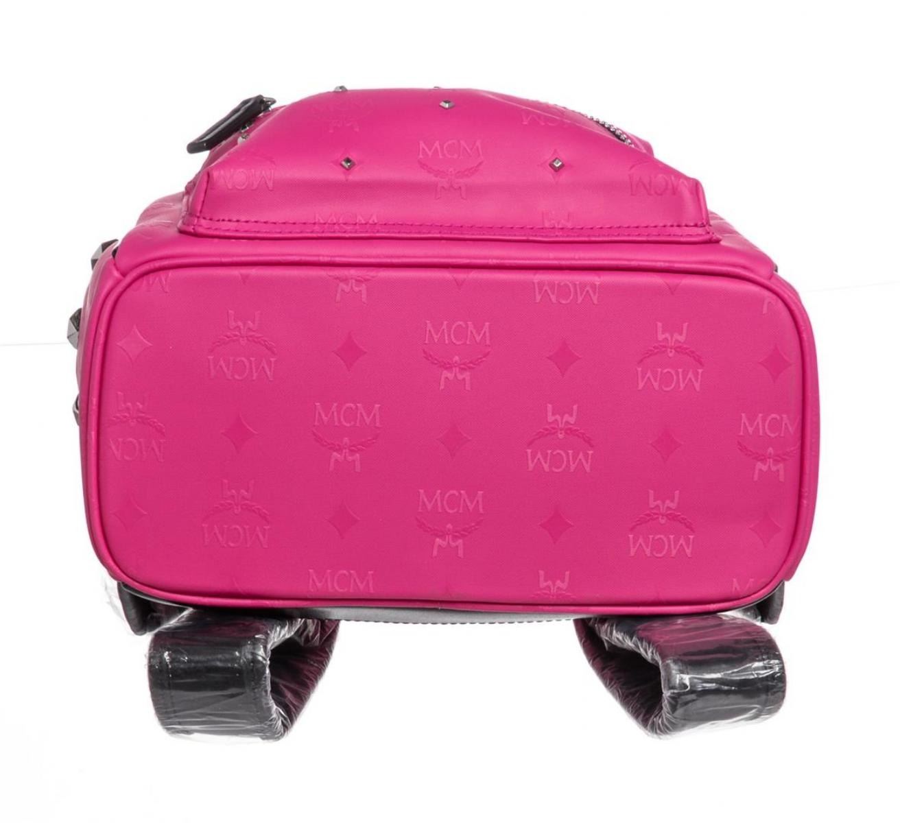 One MCM Beet Root Pink Small Coated Canvas Stark Odeon Backpack. Beet root pink coated canvas MCM small Stark Odeon backpack with silver-tone hardware, dual flat shoulder straps, single rolled top handle, black leather trim, three exterior pockets; one with zip closure, stud accents at exterior, black suede lining, dual slit pockets at interior wall and zip closure at top.