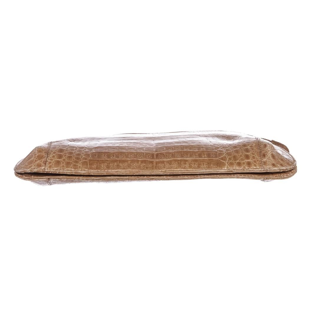 Beige crocodile MCM evening clutch with gold tone hardware, leather interior lining, zipper pocket at interior wall and a overall zipper closure.