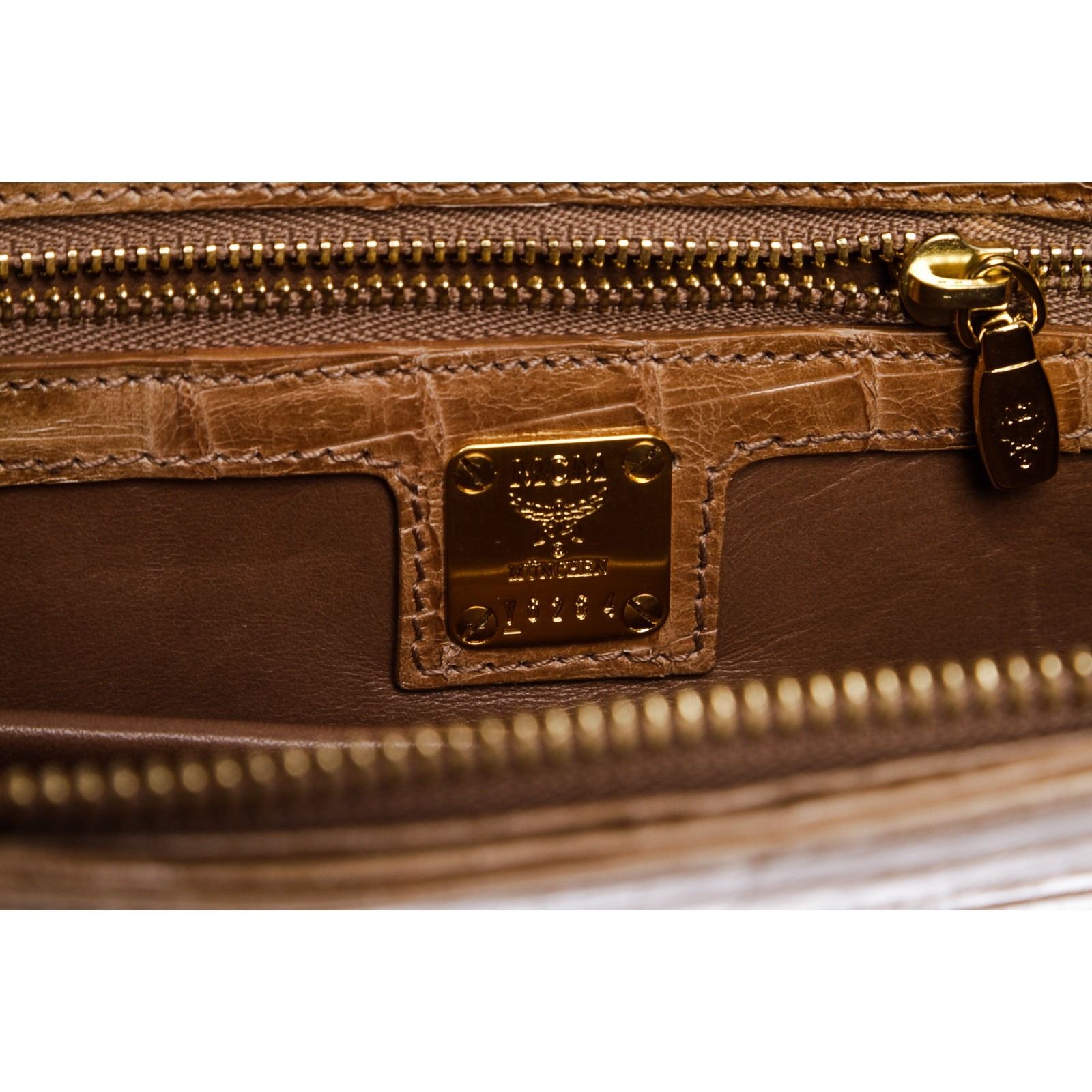 Beige croc embossed MCM leather evening clutch with gold tone hardware, leather interior lining, zipper pocket at interior wall and a overall zipper closure
