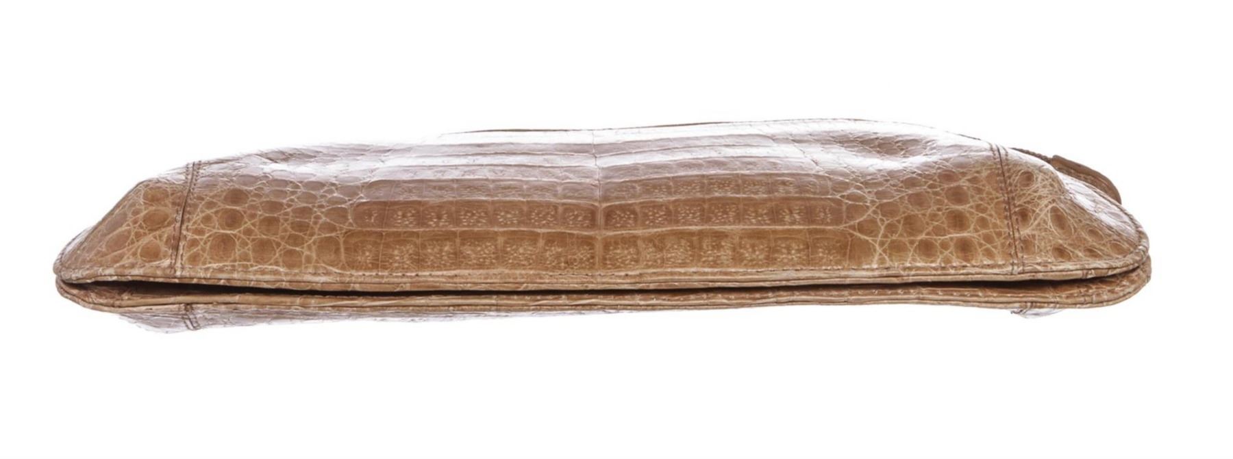 One MCM Beige Crocodile Evening Clutch Bag. Beige crocodile MCM evening clutch with gold tone hardware, leather interior lining, zipper pocket at interior wall and a overall zipper closure.