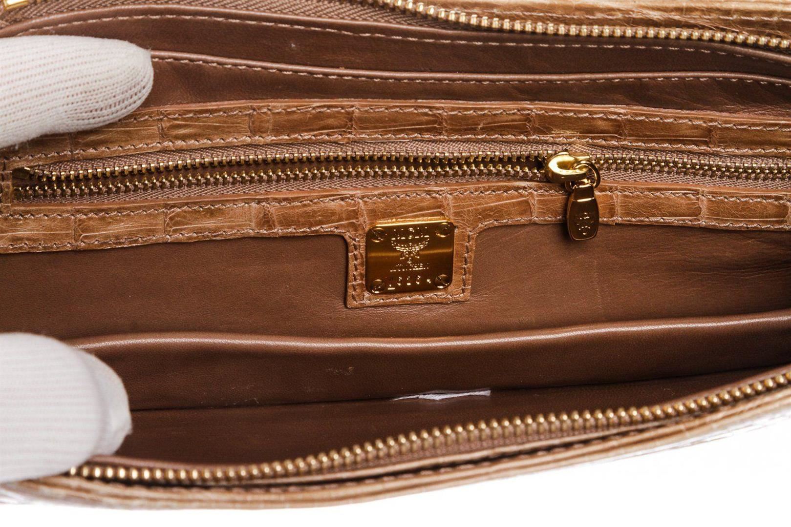 Beige crocodile MCM evening clutch with gold tone hardware, leather interior lining, zipper pocket at interior wall and a overall zipper closure. MEASUREMENTS: 13 13 in / 33 cm 1.75 1.75 in / 4 cm 5 5 in / 13 cm Condition: Pre-Owned Good Good overall, please see photographs for details.