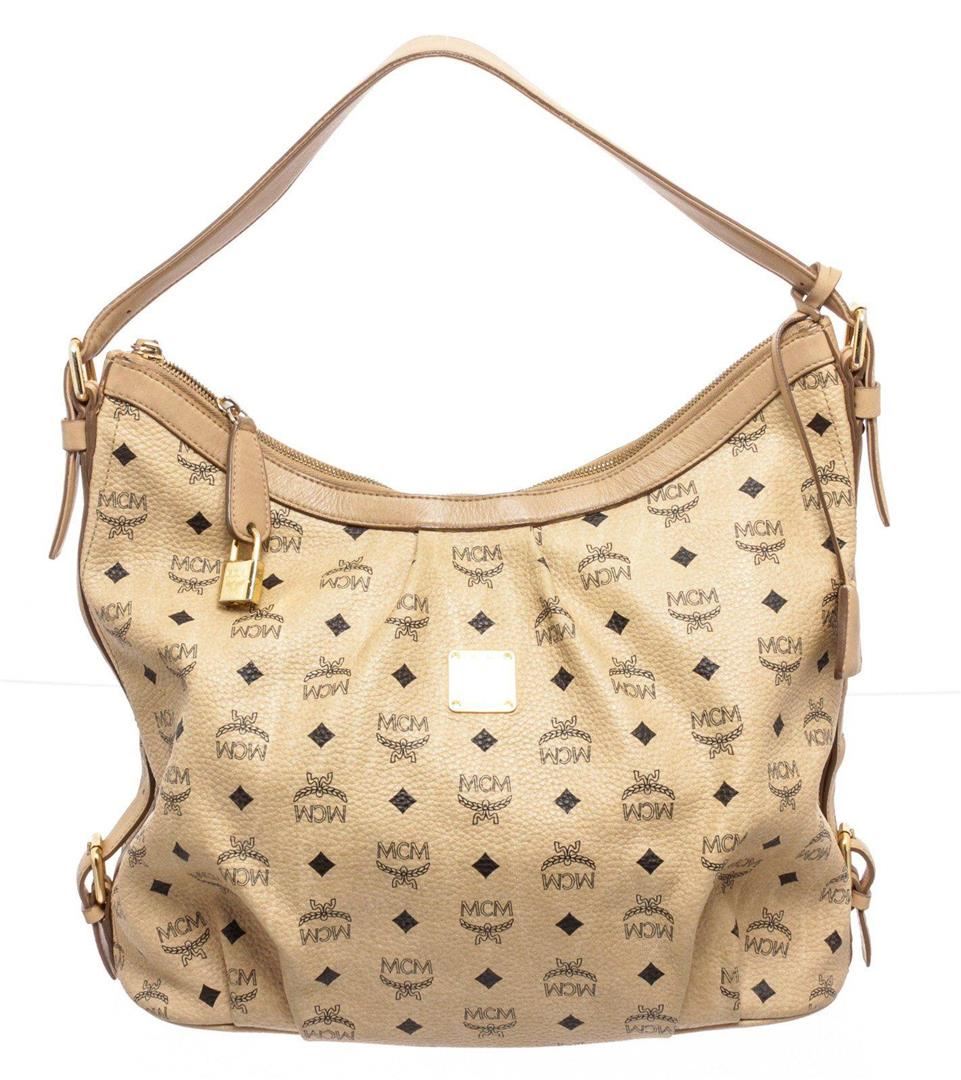 MCM Beige Leather Hobo Bag with silver-tone hardware, trim, three interior compartments pockets, canvas lining, top handle, leather shoulder strap, and zip closure. CONDITION: Pre-Owned Good overall, please see photographs for detail.
