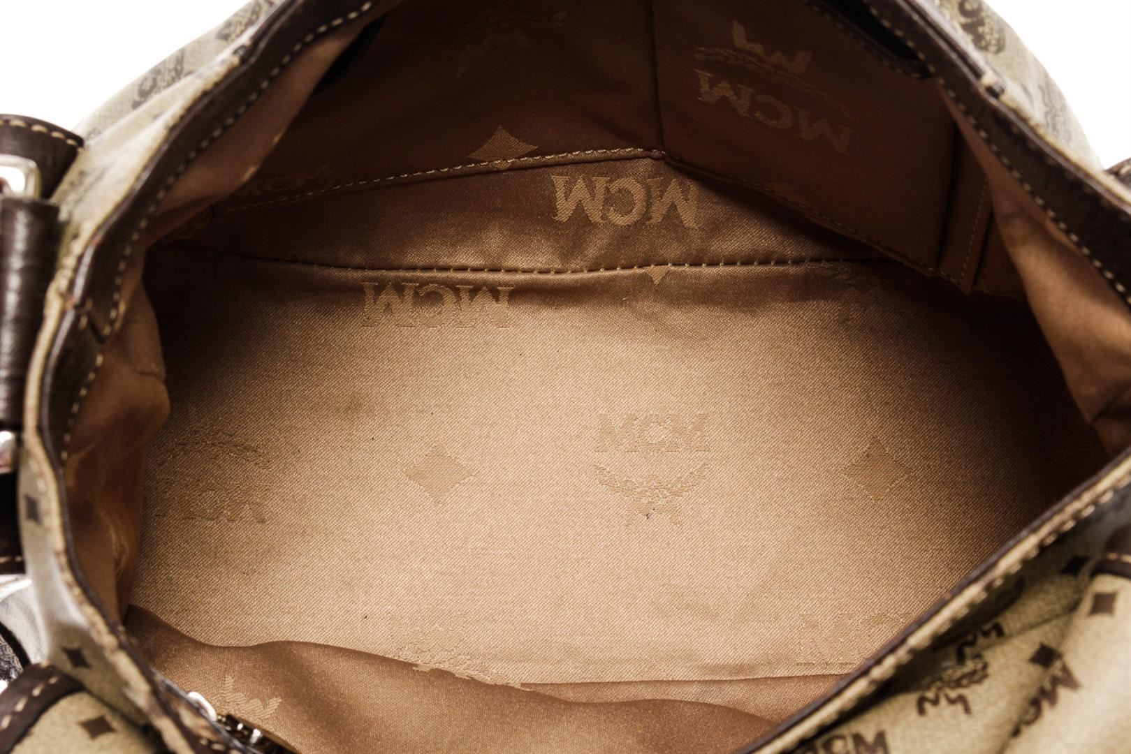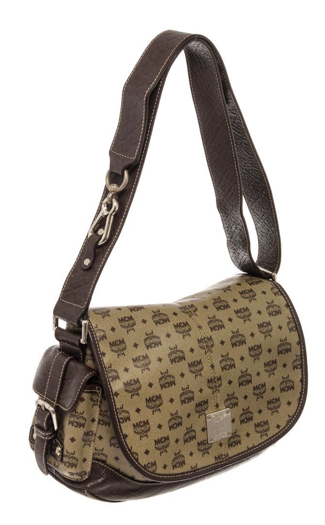 MCM shoulder bag features beige Monogram Visetos coated canvas with silver-tone hardware, brown leather trim, an adjustable leather shoulder strap, two exterior pocket with flap and buckle detail, brown textured leather at base and flap closure at top wit