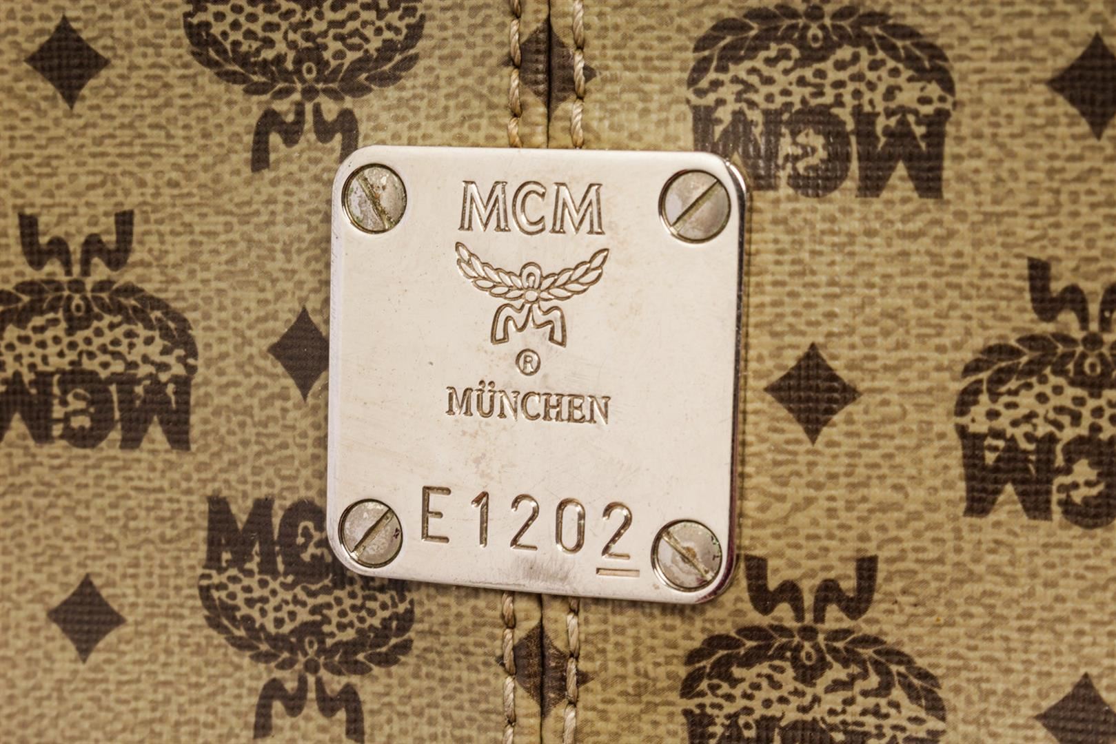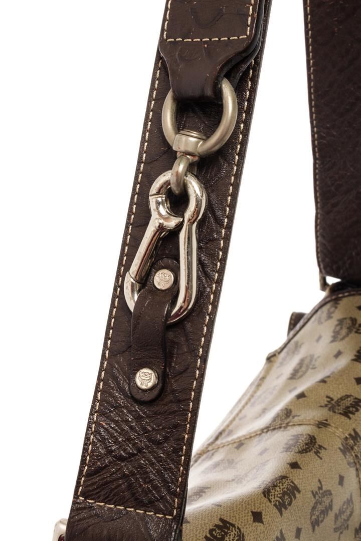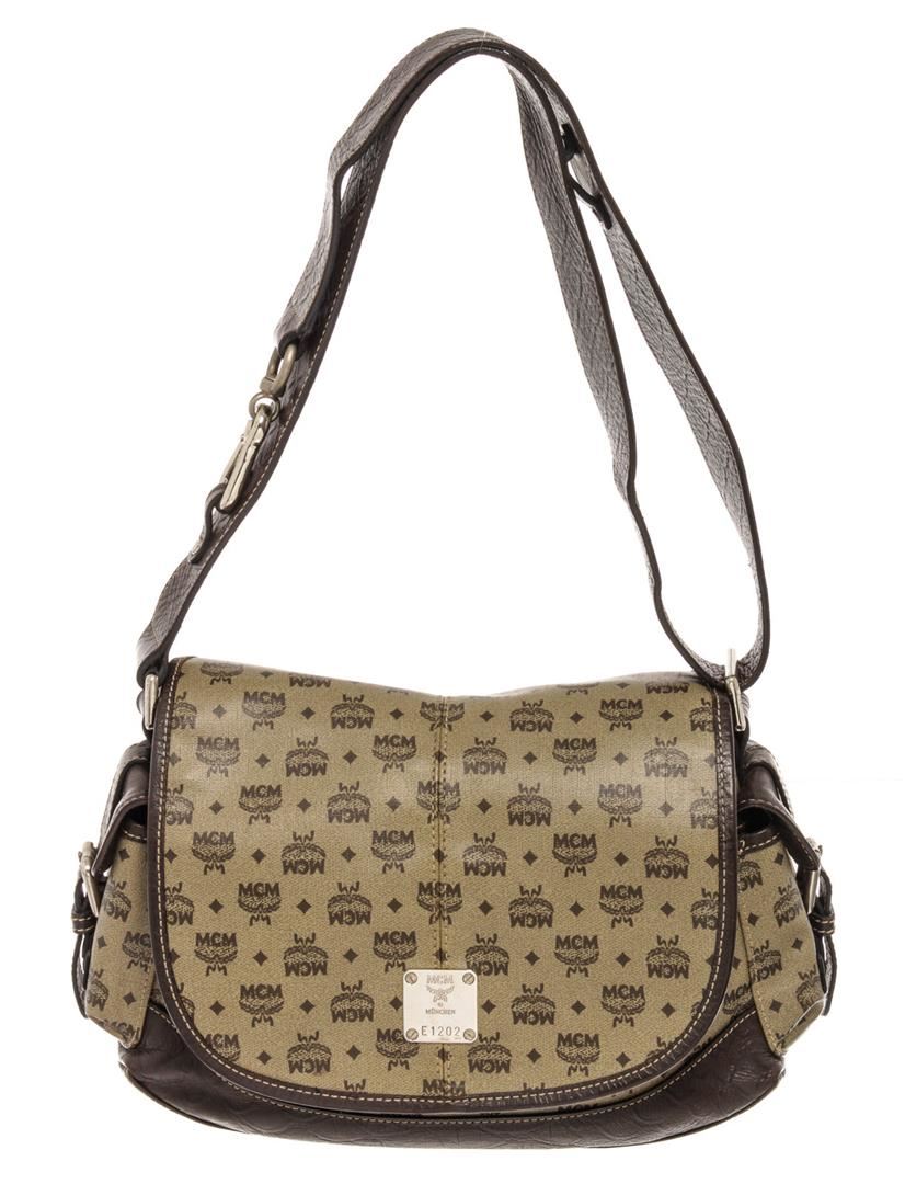 MCM shoulder bag features beige Monogram Visetos coated canvas with silver-tone hardware, brown leather trim, an adjustable leather shoulder strap, two exterior pocket with flap and buckle detail, brown textured leather at base and flap closure at top wit