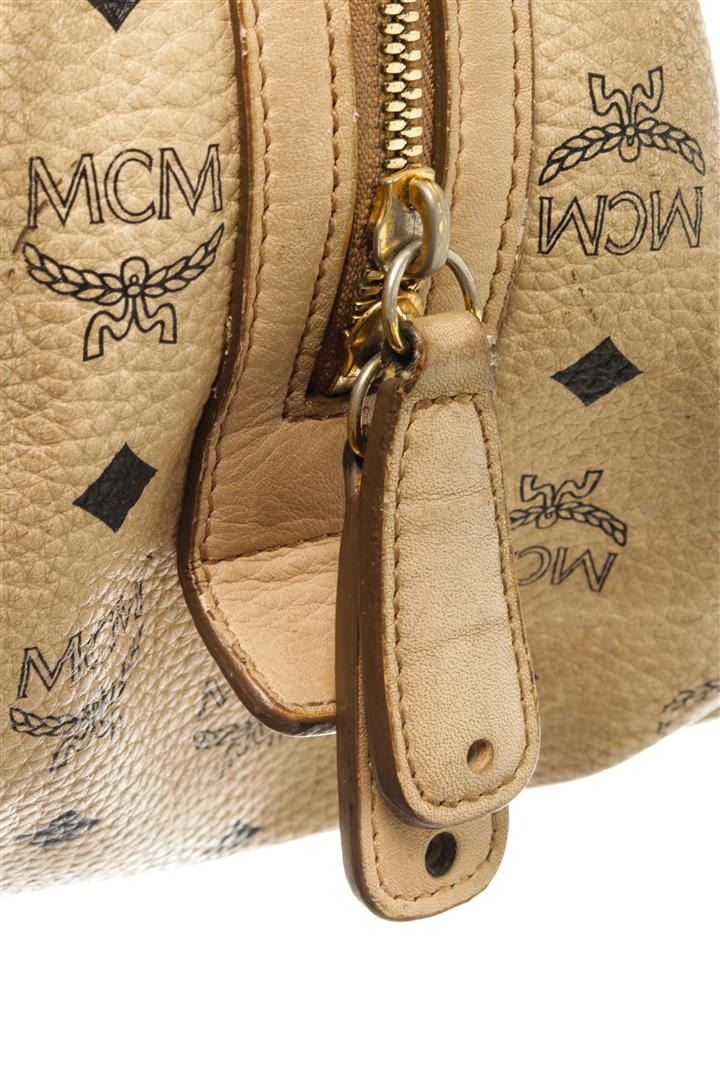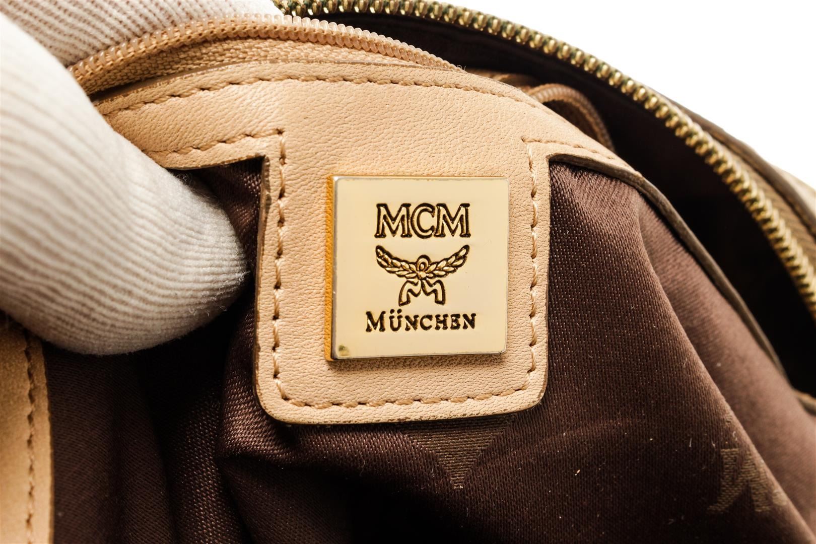 One MCM Beige Visetos Leather Shoulder Bag. Item is sold AS-IS. All available information is listed in the description and shown in the photo. MCM beige visetos leather shoulder bag with logo-patterned beige leather exterior, brown fabric interior lining, buckle and strap detailing on the exterior, two top handles, gold-tone hardware, two-way zipper closure, one interior slip pocket, and one interior zip pocket.