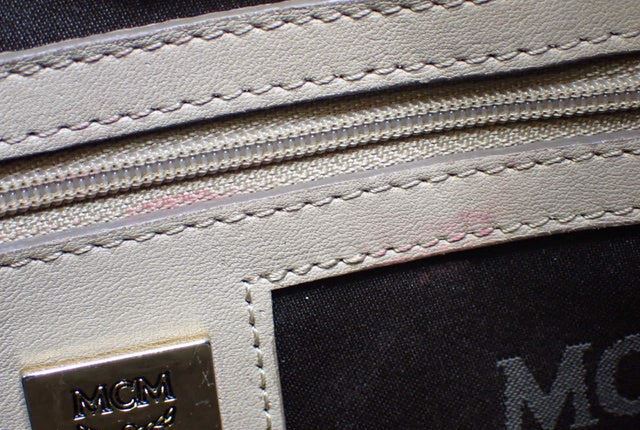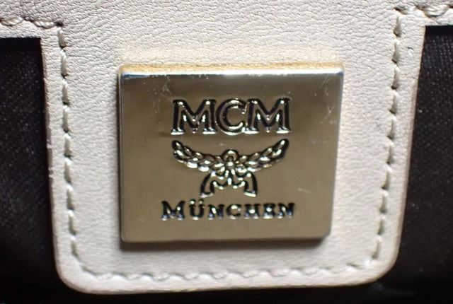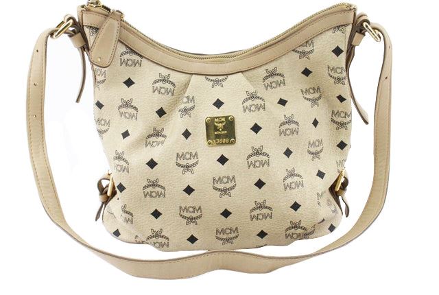 MCM shoulder bag with beige Visetos Monogram canvas leather, gold-tone hardware, beige Visetos coated canvas trim, interior slip pocket, adjustable shoulder strap, zipper closure at top and brown jacquard canvas lining. 13.4" x 6" x 13.8" Handle Drop: