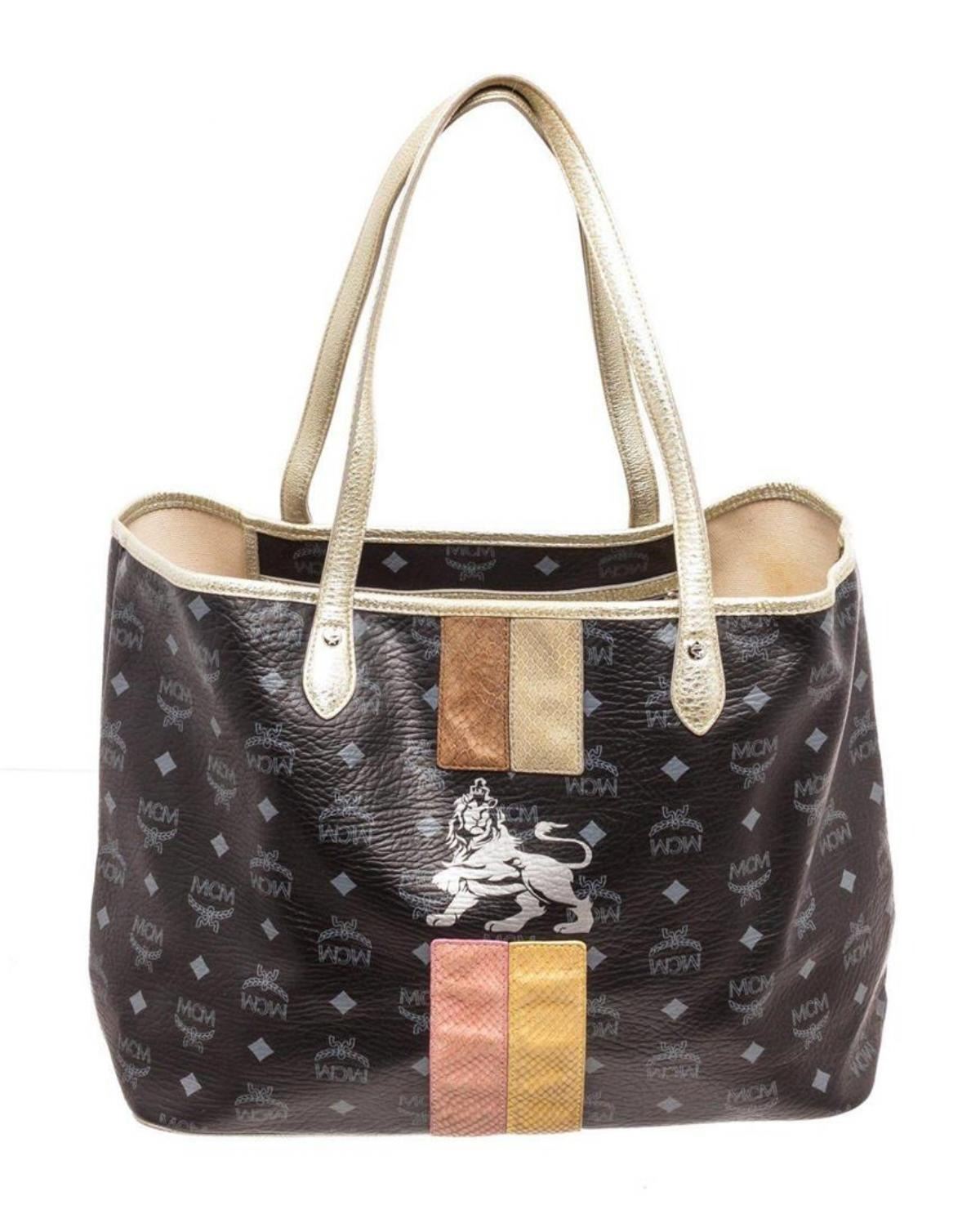 MCM Black Coated Canvas & Leather Large Lion Shopper Shoulder Bag with silver-tone hardware, leather shoulder strap, and zip closure. CONDITION: Pre-Owned Good overall, please see photographs for detail.