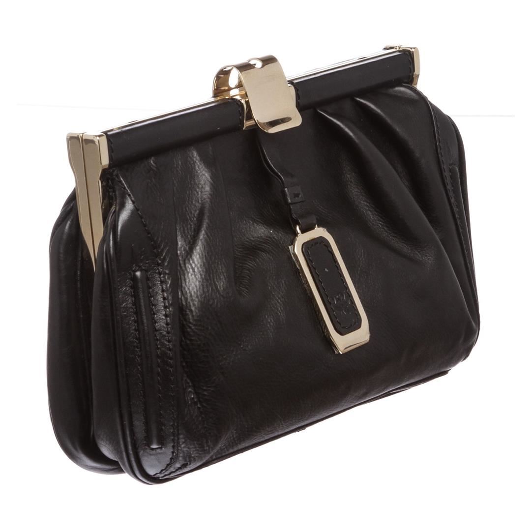 Black leather MCM clutch with gold-tone hardware, MCM toggle at front, tan suede lining, one slip pocket and one zipper pocket at interior wall and push-lock closure at top. Includes removable shoulder strap. Shop MCM handbags at MARQUE SUPPLY COMPANY