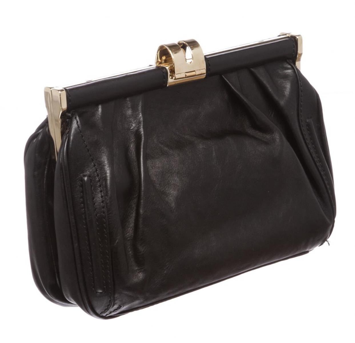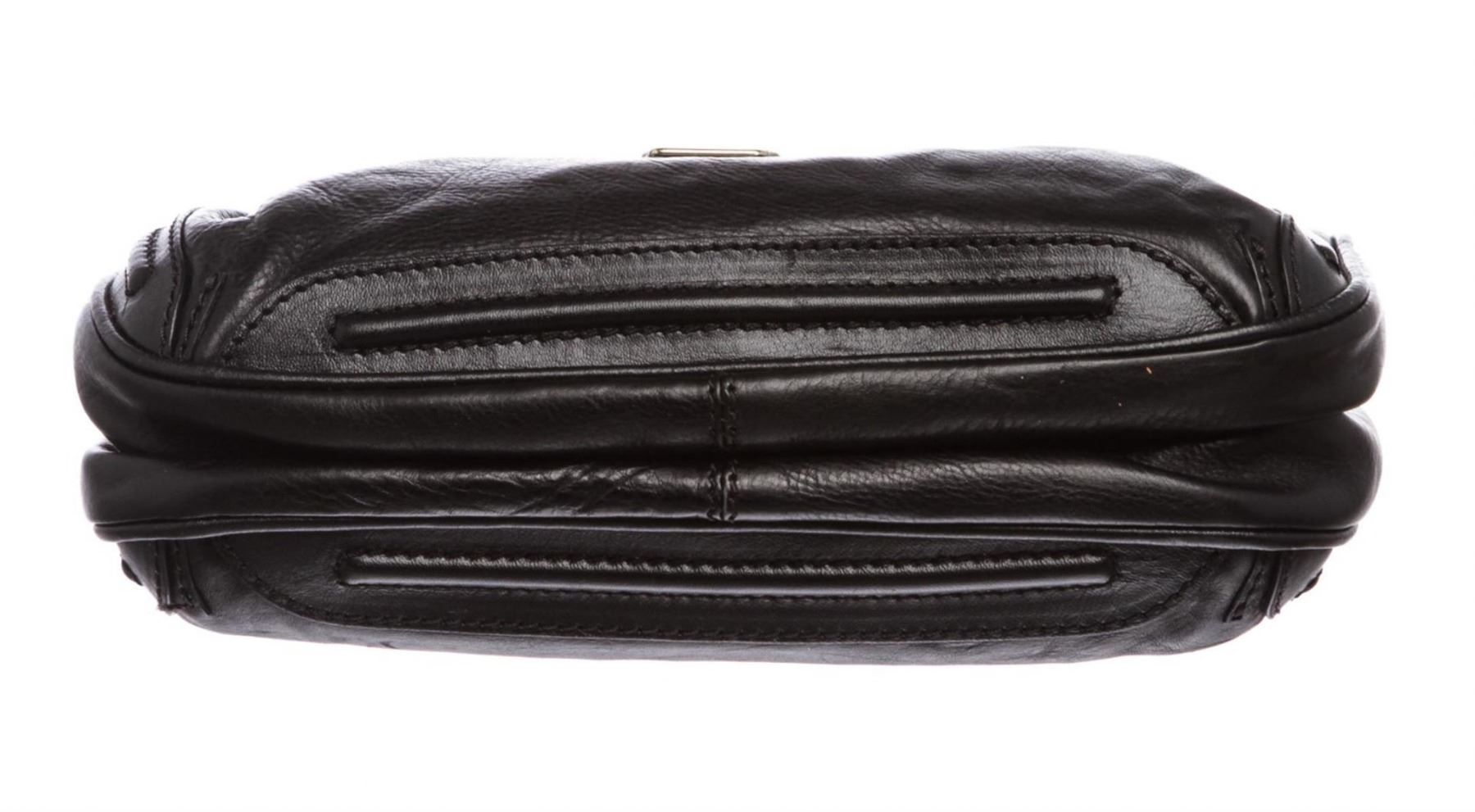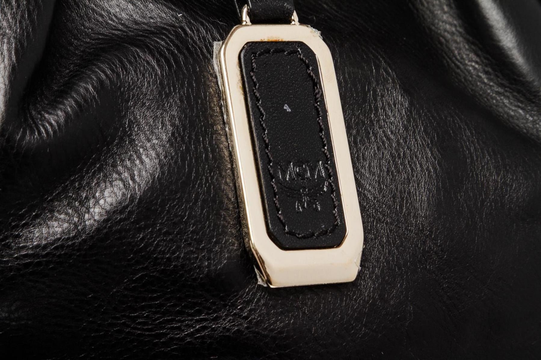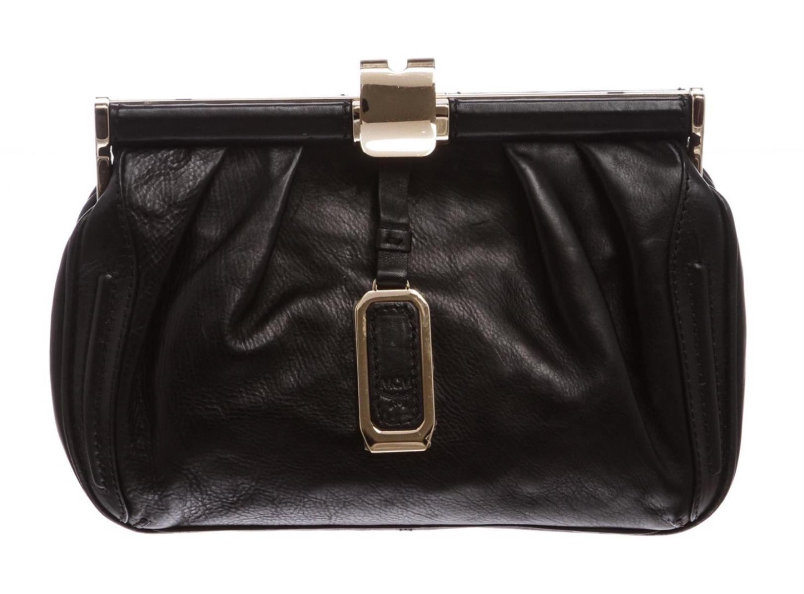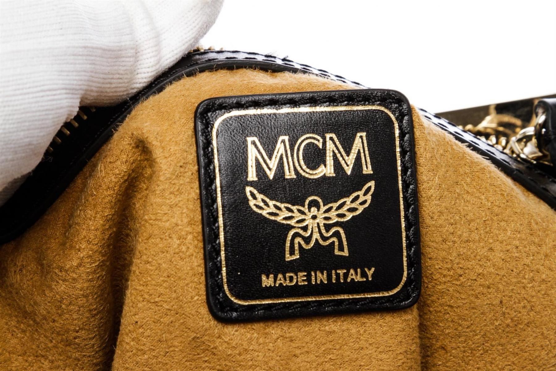 One MCM Black Leather Small Clutch. Black leather MCM clutch with gold-tone hardware, MCM toggle at front, tan suede lining, one slip pocket and one zipper pocket at interior wall and push-lock closure at top. Includes removable shoulder strap. MCM handbags