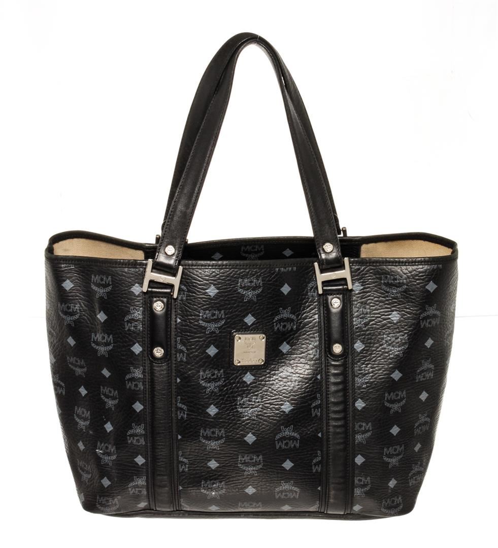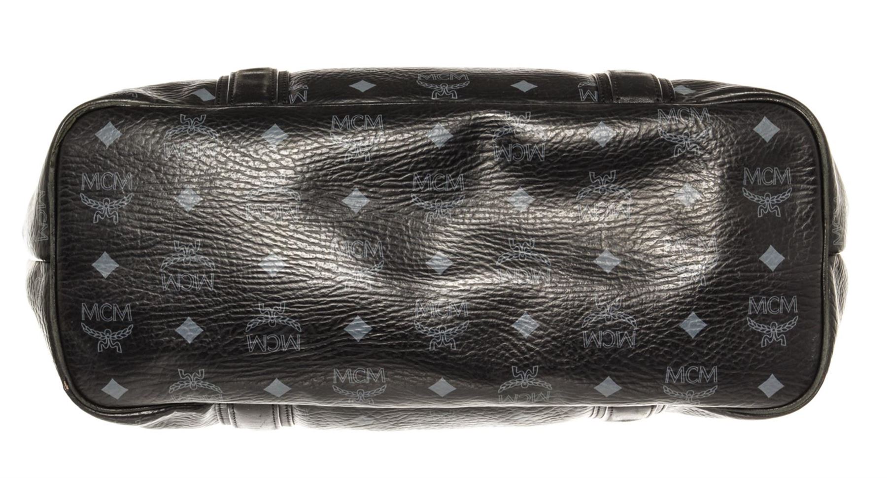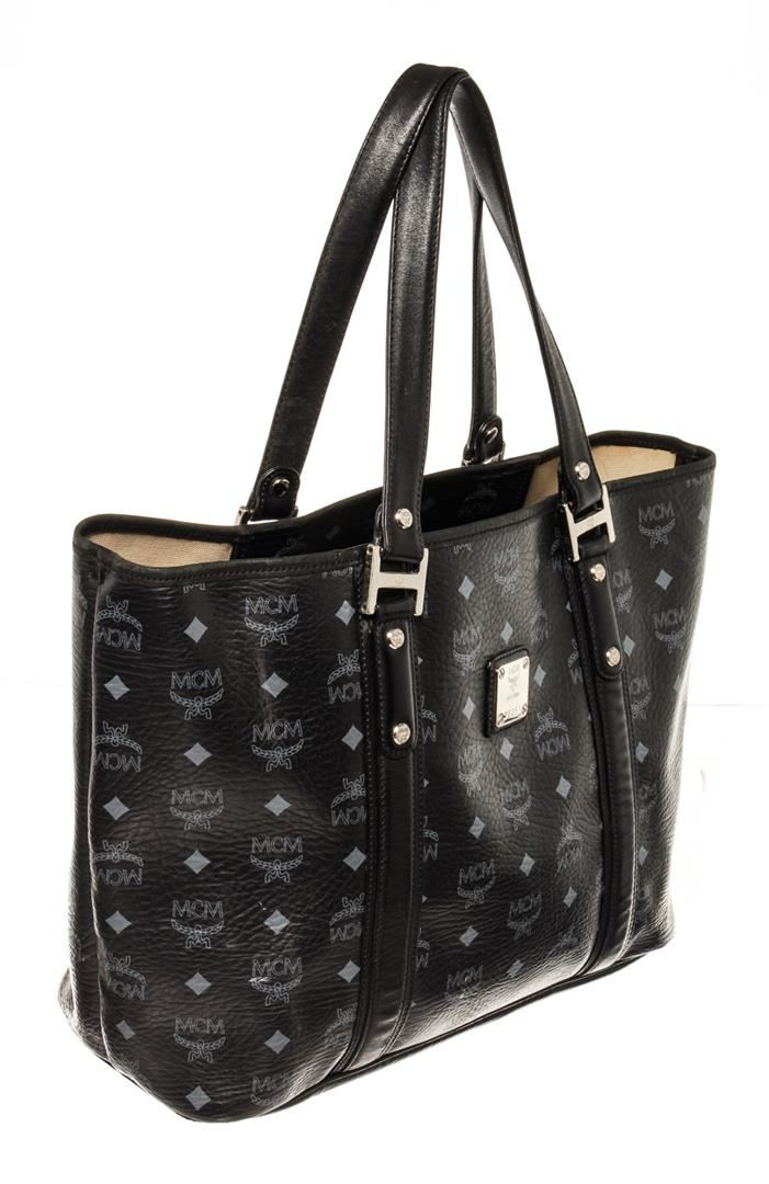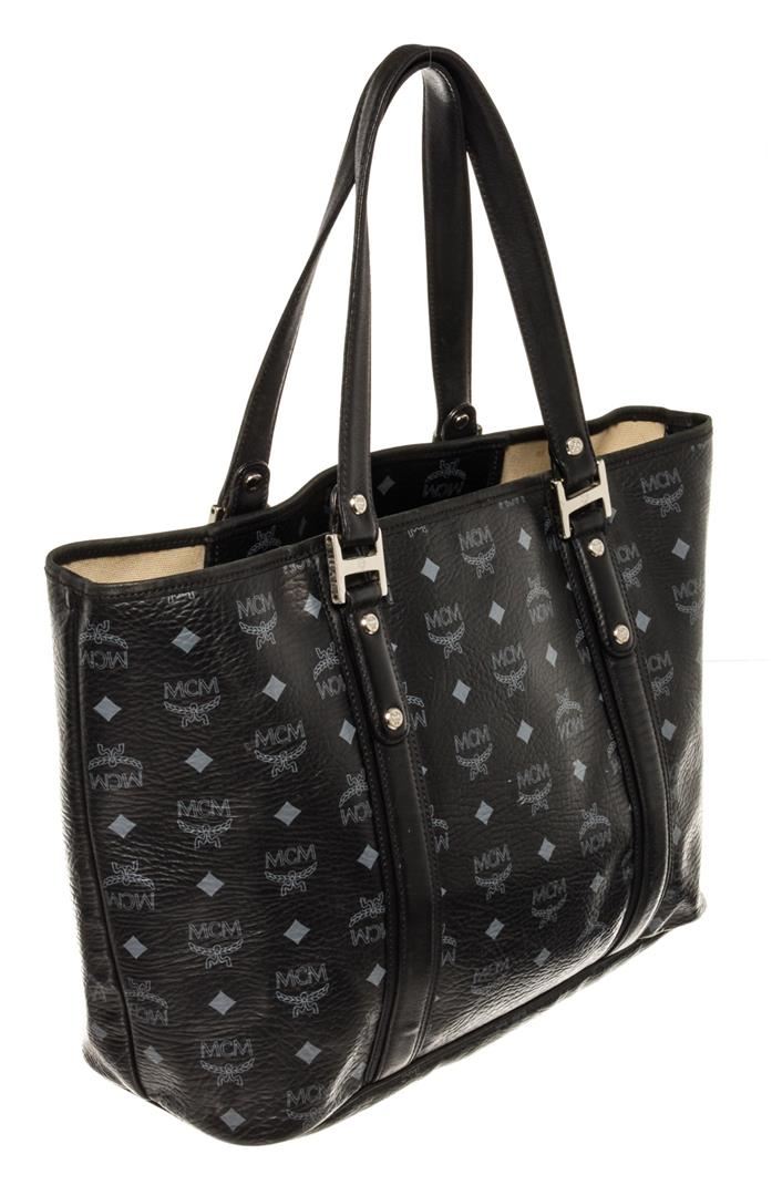 MCM tote bag features black and grey Monogram canvas leather, silver-tone hardware, magnetic snap closure at top, double flat leather handles and canvas-lined interior with two leather flap slip pockets & key hook. 11" x 14" x 6" Handle Drop 7.5"