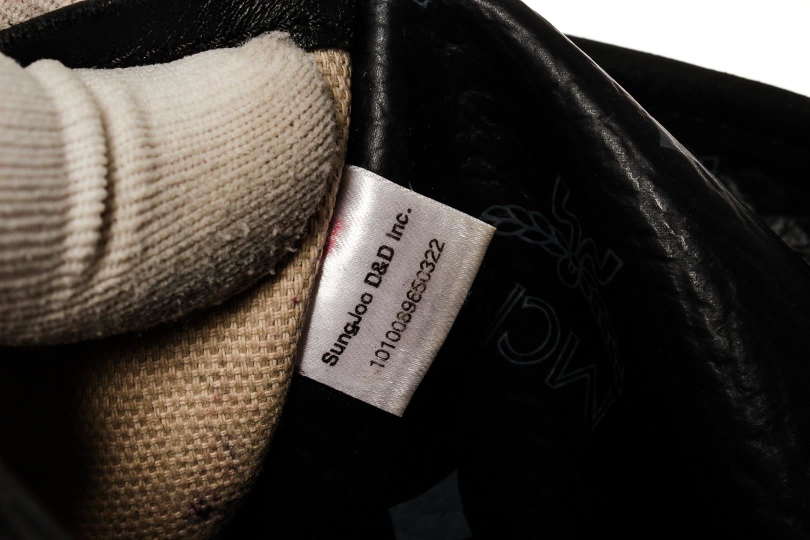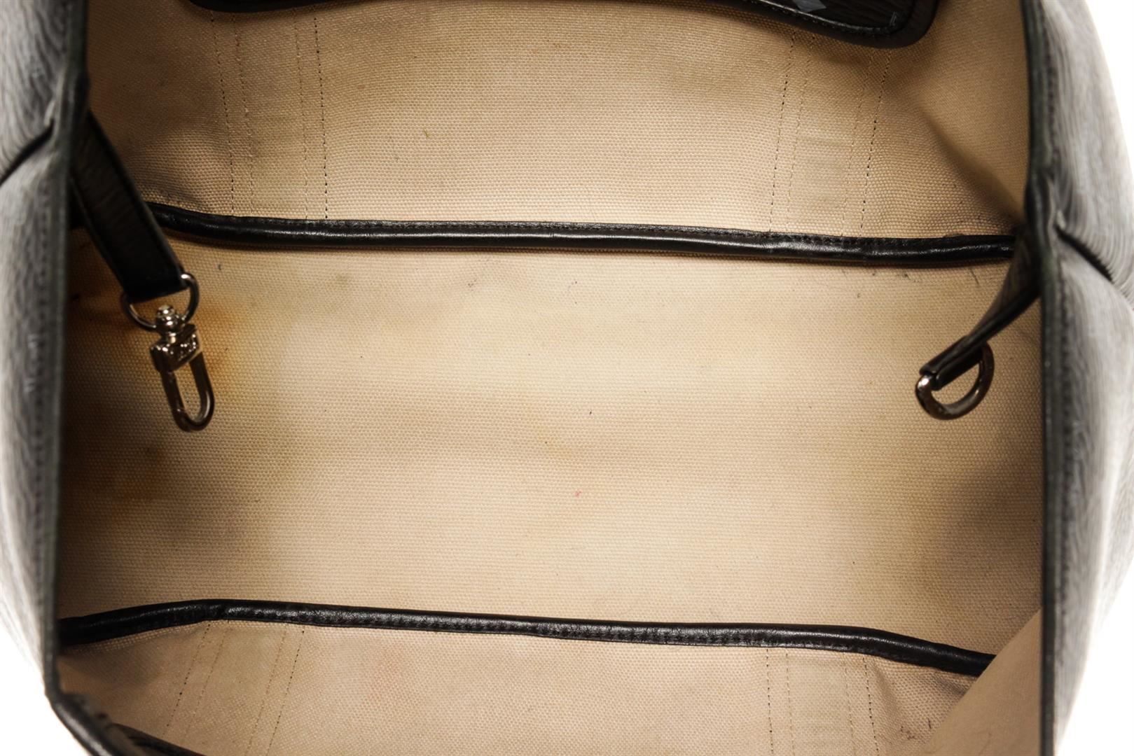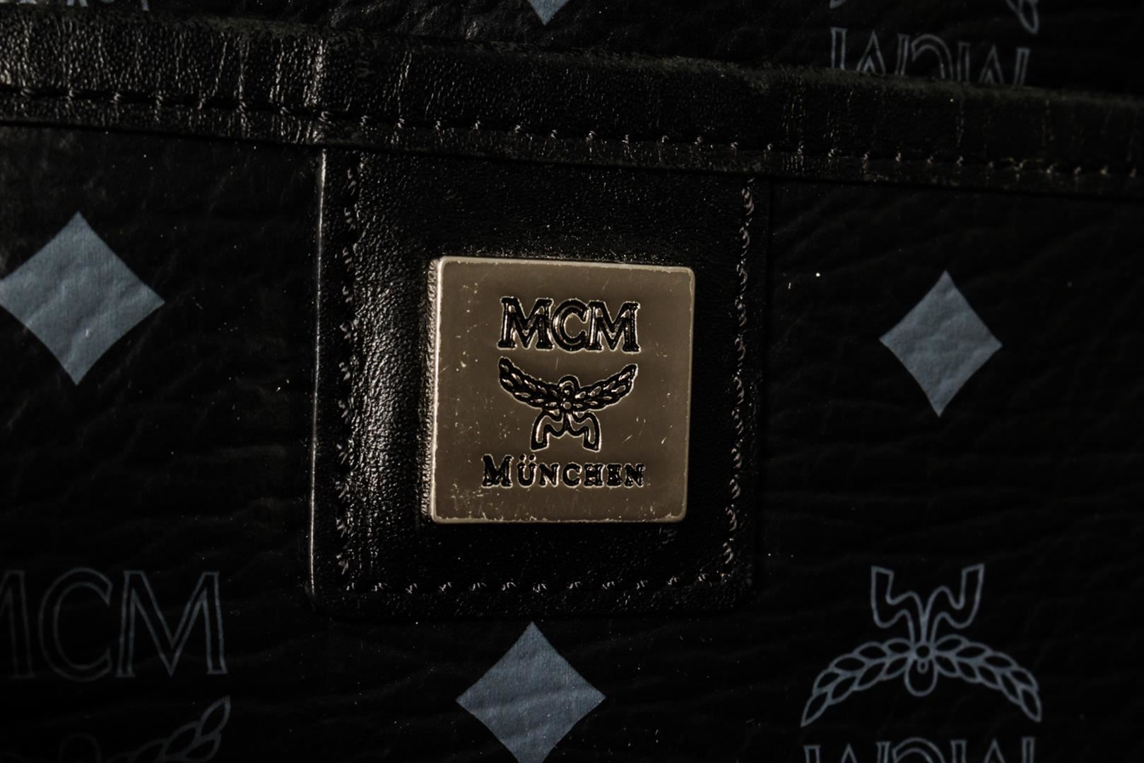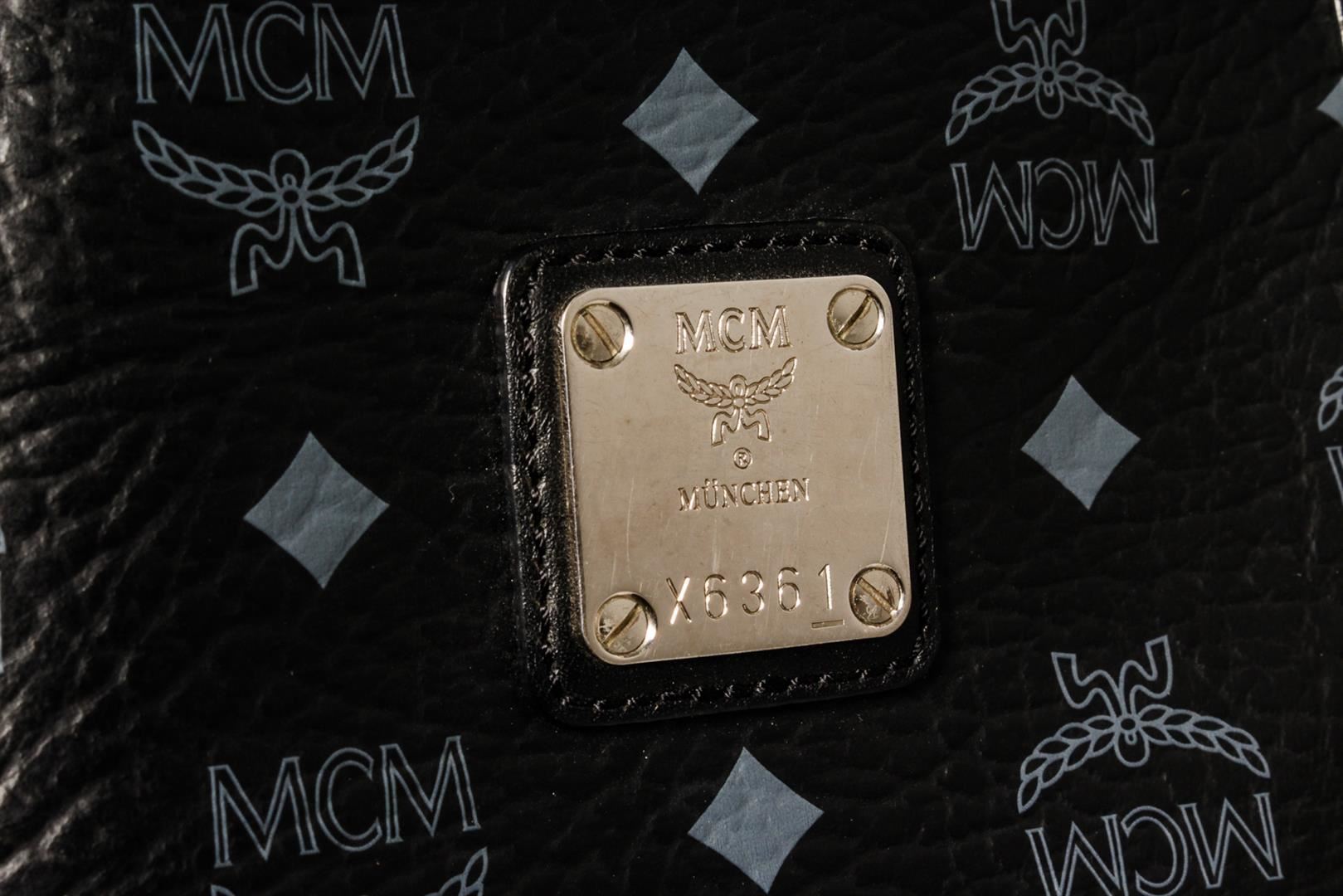 MCM tote bag features black and grey Monogram canvas leather, silver-tone hardware, magnetic snap closure at top, double flat leather handles and canvas-lined interior with two leather flap slip pockets & key hook. 11" x 14" x 6" Handle Drop 7.5"
