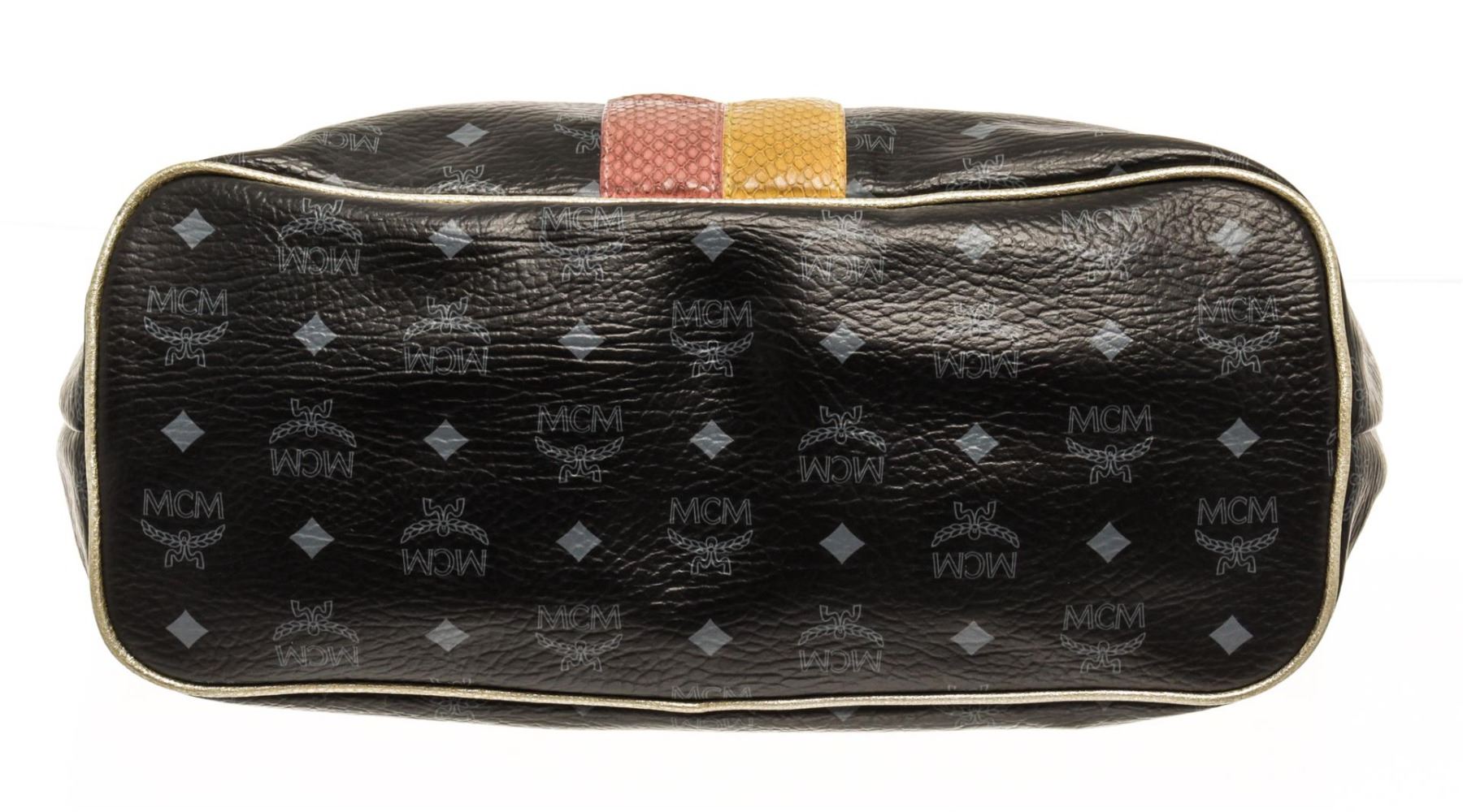 One MCM Black Monogram Visetos Logo Lion Liz Shopper Tote Bag. Item is sold AS-IS. All available information is listed in the description and shown in the photo. mcm black monogram visetos logo lion liz shopper tote bag with silver tone hardware. Please note: some interior pen staining. Height: 11 in (27.94 cm), Width: 6 in (15.24 cm), Length: 16 in (40.64 cm)