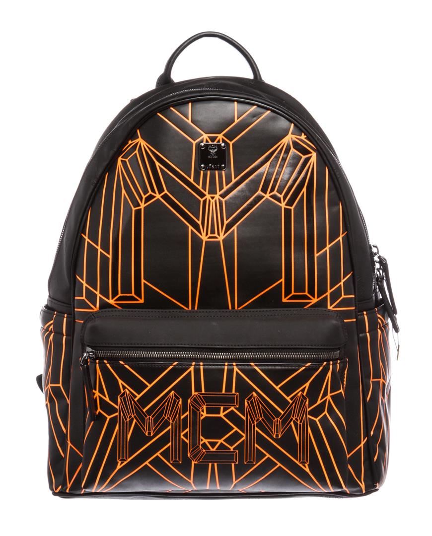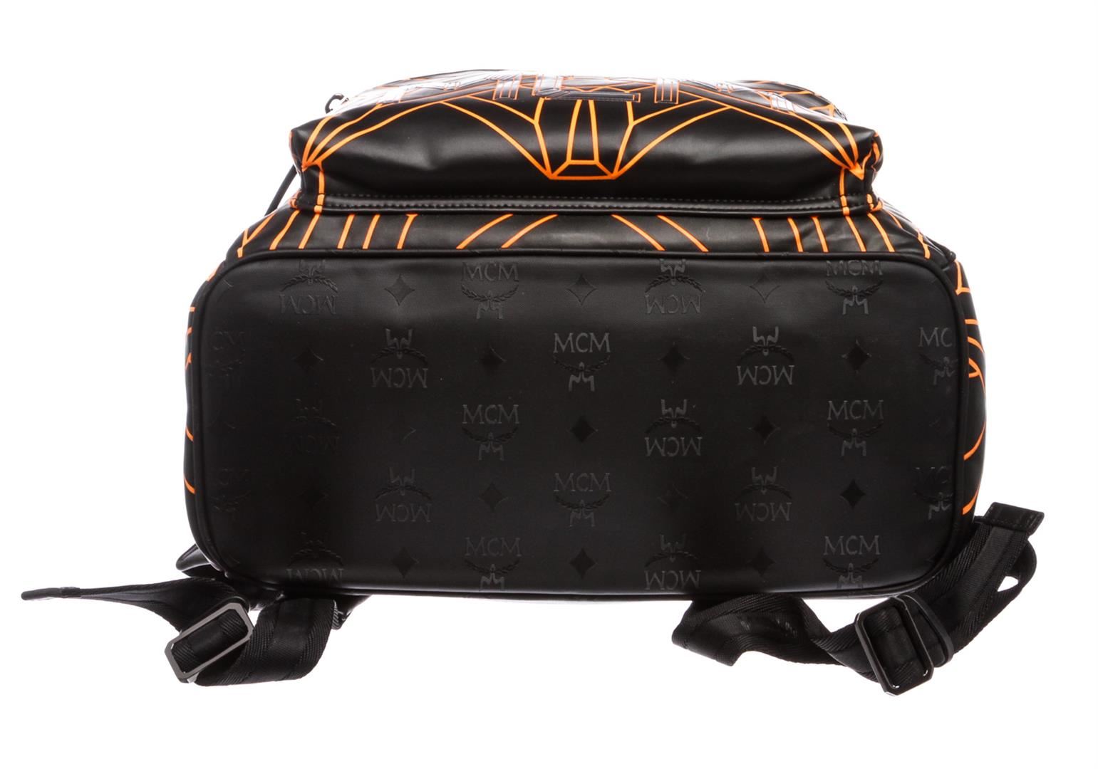 Black and orange embossed Visetos coated canvas MCM Bionic backpack with gunmetal hardware, dual adjustable shoulder straps, single flat handle at top, logo placard and zip pocket at front face, dual pockets at gussets, woven interior lining, expandable wall pocket with zip pocket, one side slip pocket and zip closure at top.