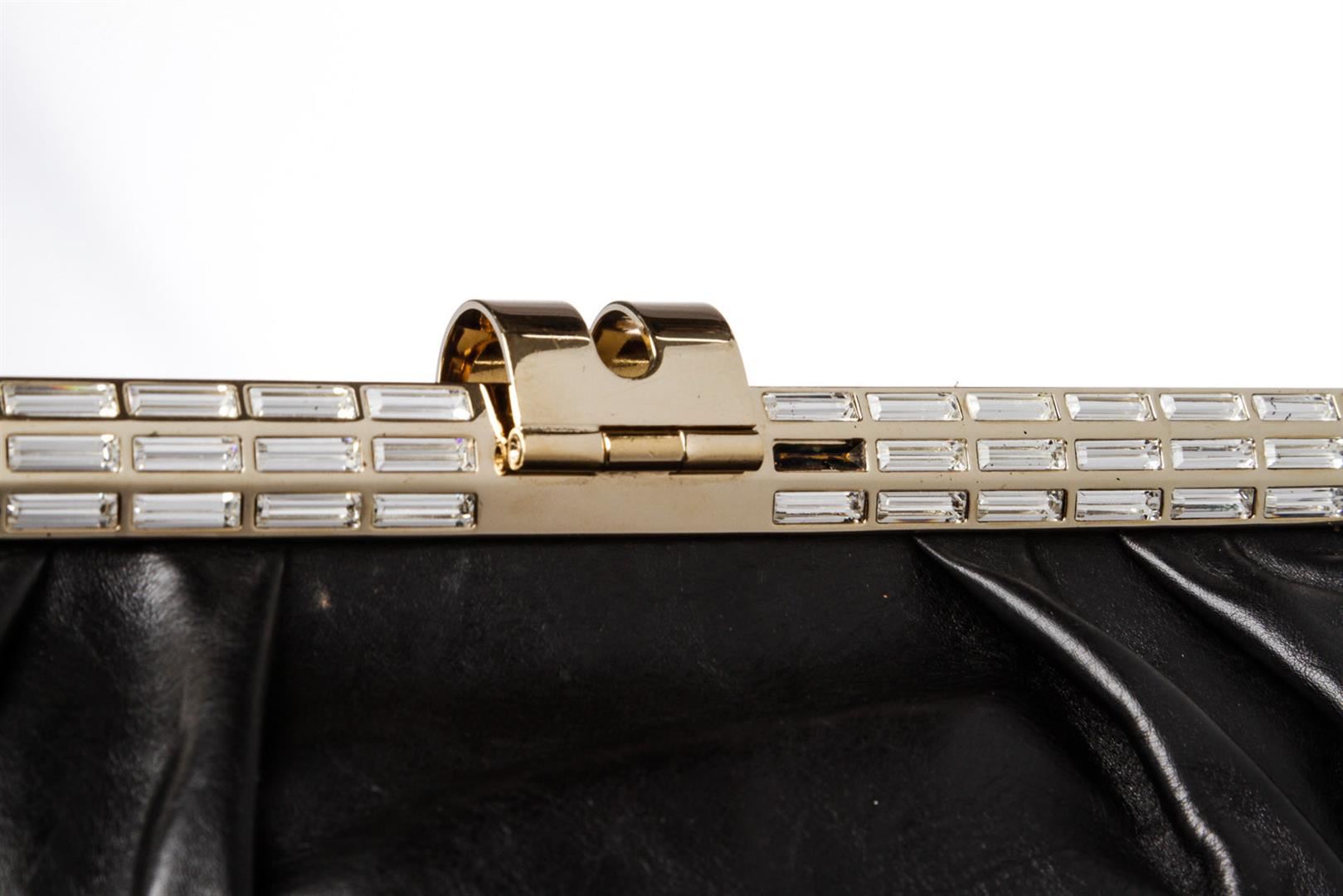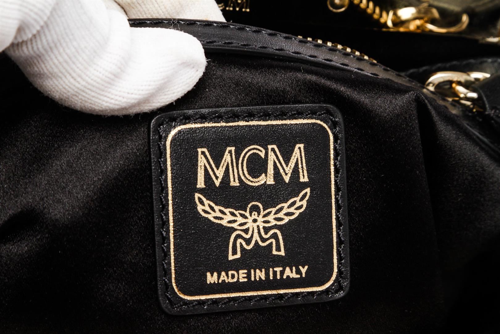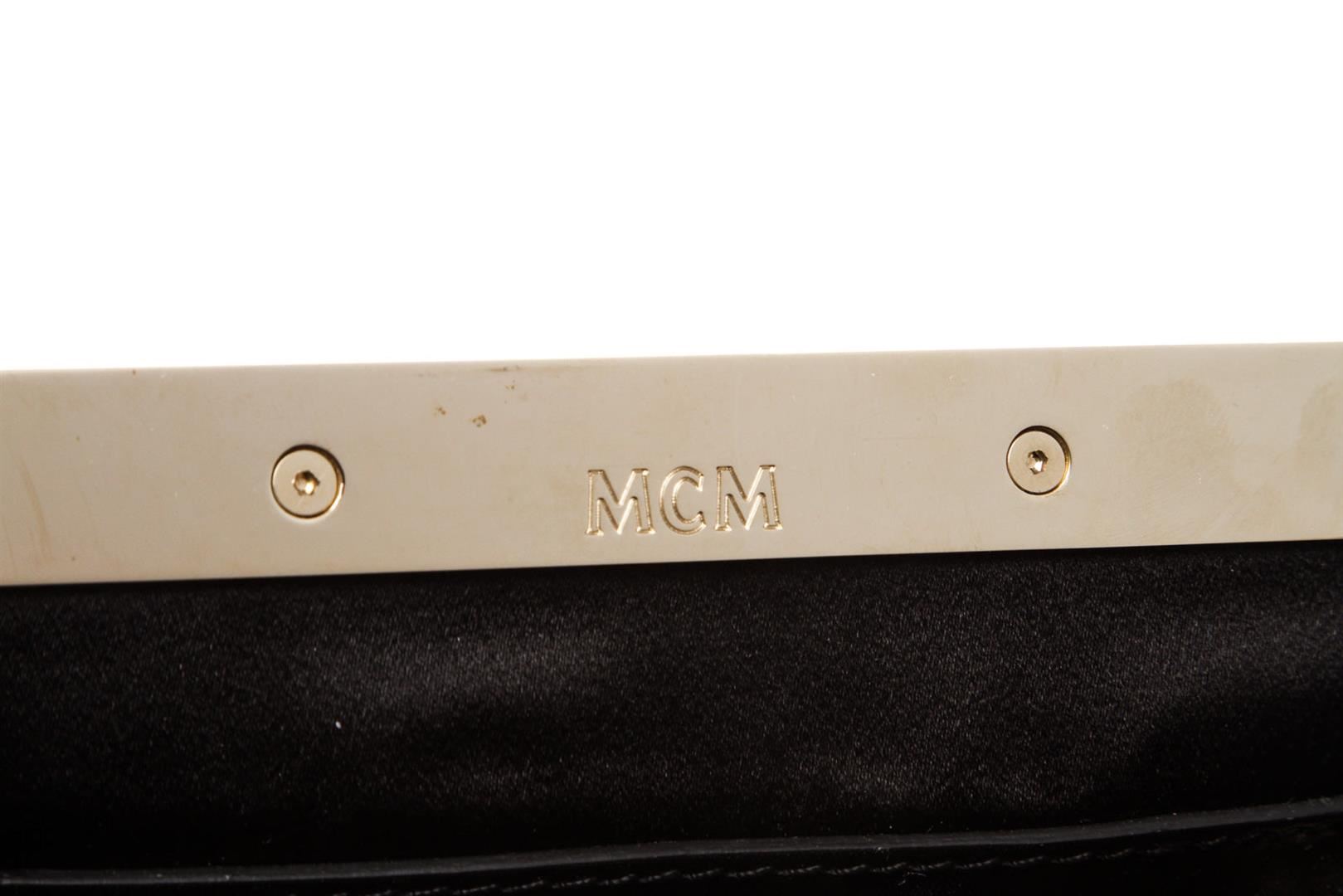 Black leather MCM clutch with gold-tone hardware and small crystal embellishments at top. Interior contains black satin lining with one slip pocket and one zipper pocket at interior wall and push-lock closure at top. Includes removable chain shoulder strap.