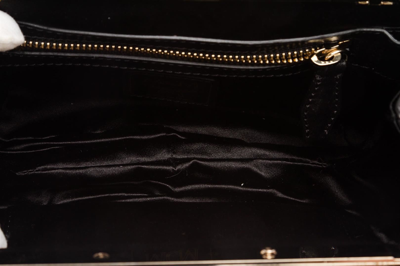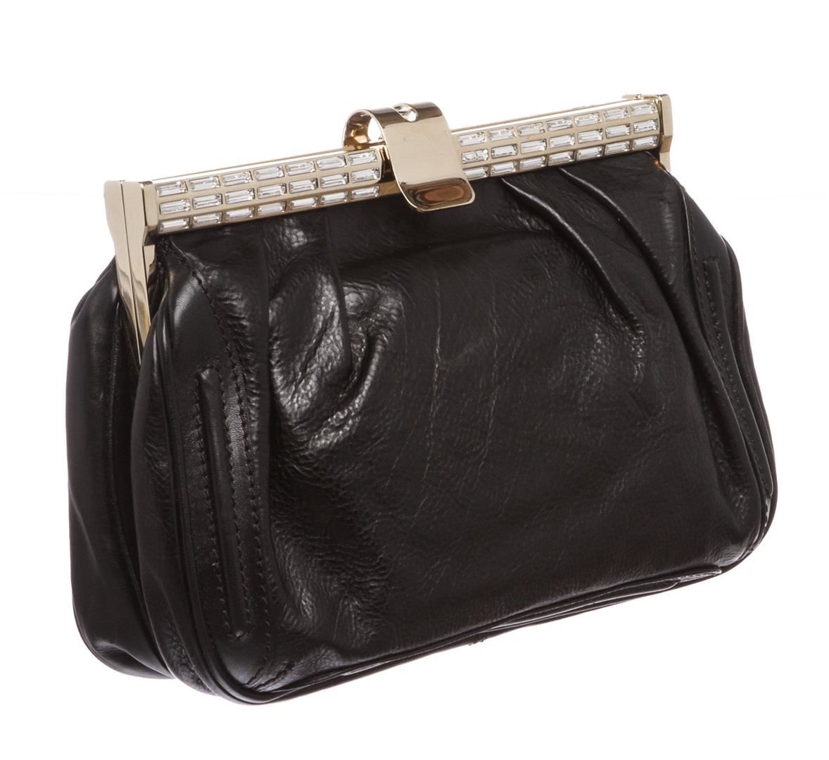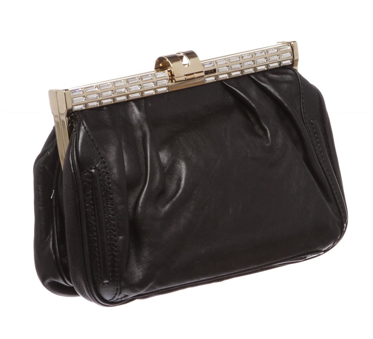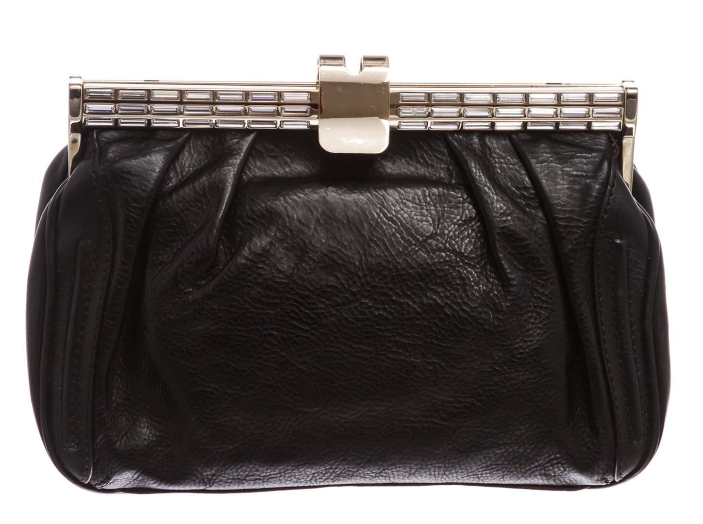 Black leather MCM clutch with gold-tone hardware and small crystal embellishments at top. Interior contains black satin lining with one slip pocket and one zipper pocket at interior wall and push-lock closure at top. Includes removable chain shoulder strap.