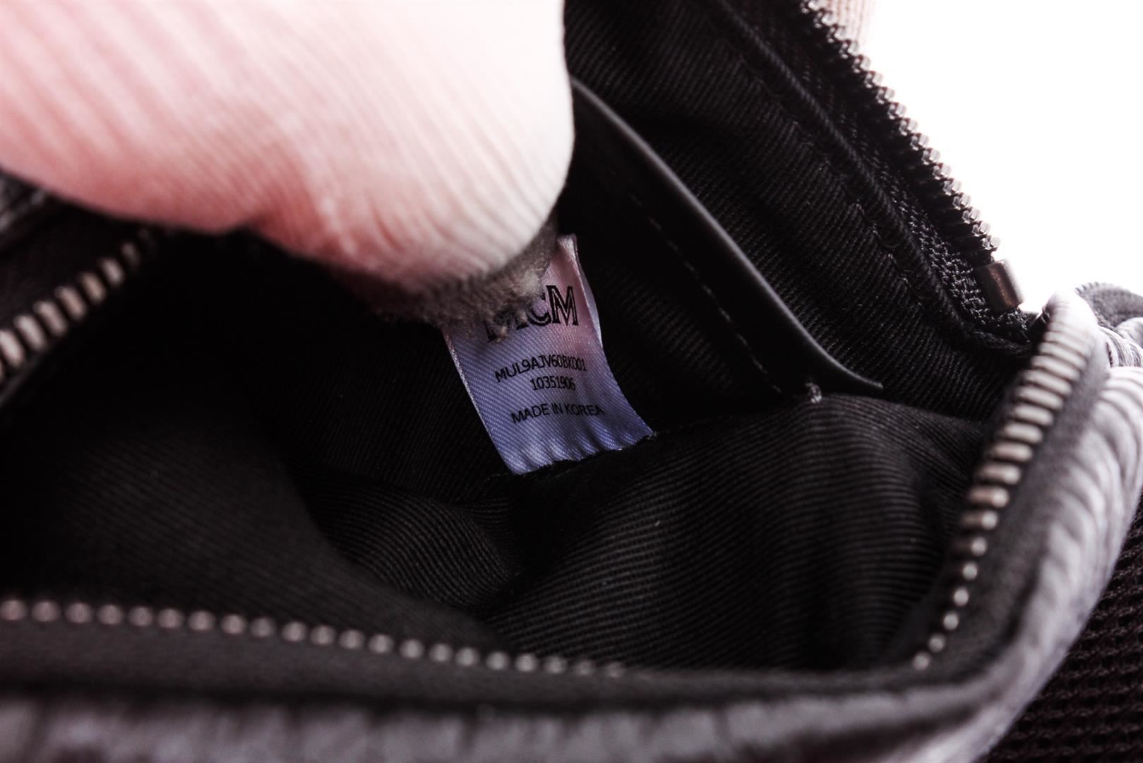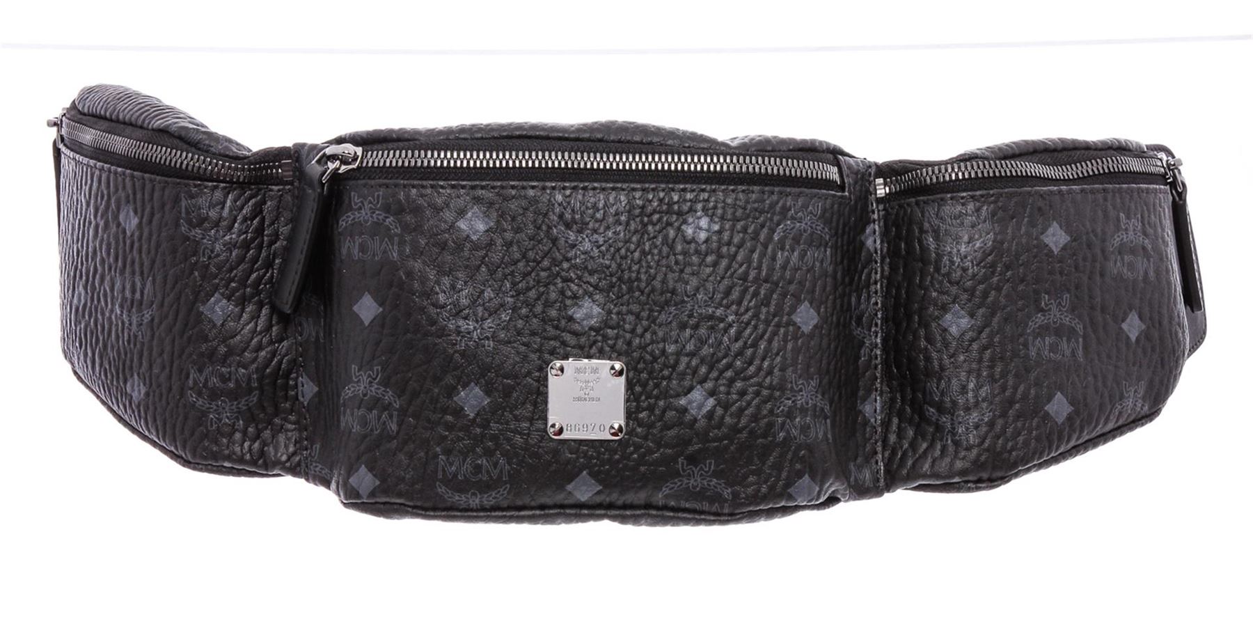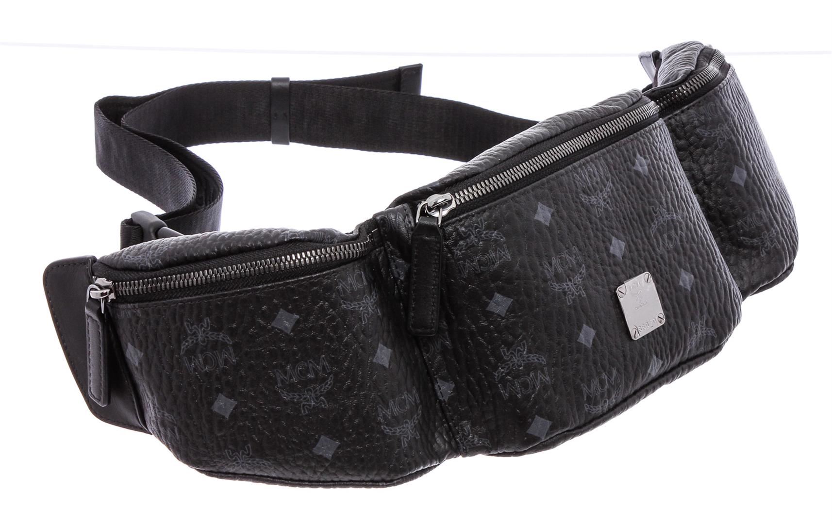 Black MCM visetos coated canvas Large Jemison sling bag with silver-tone hardware, debossed metal plate at front, three exterior zip pockets; one with slip pocket, black fabric lining and adjustable logo belt strap.