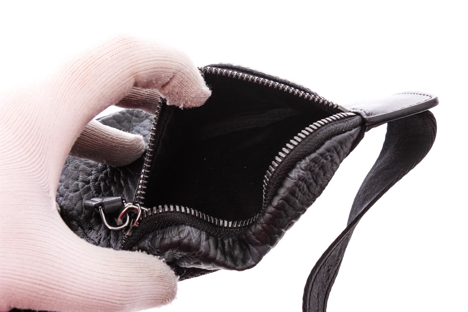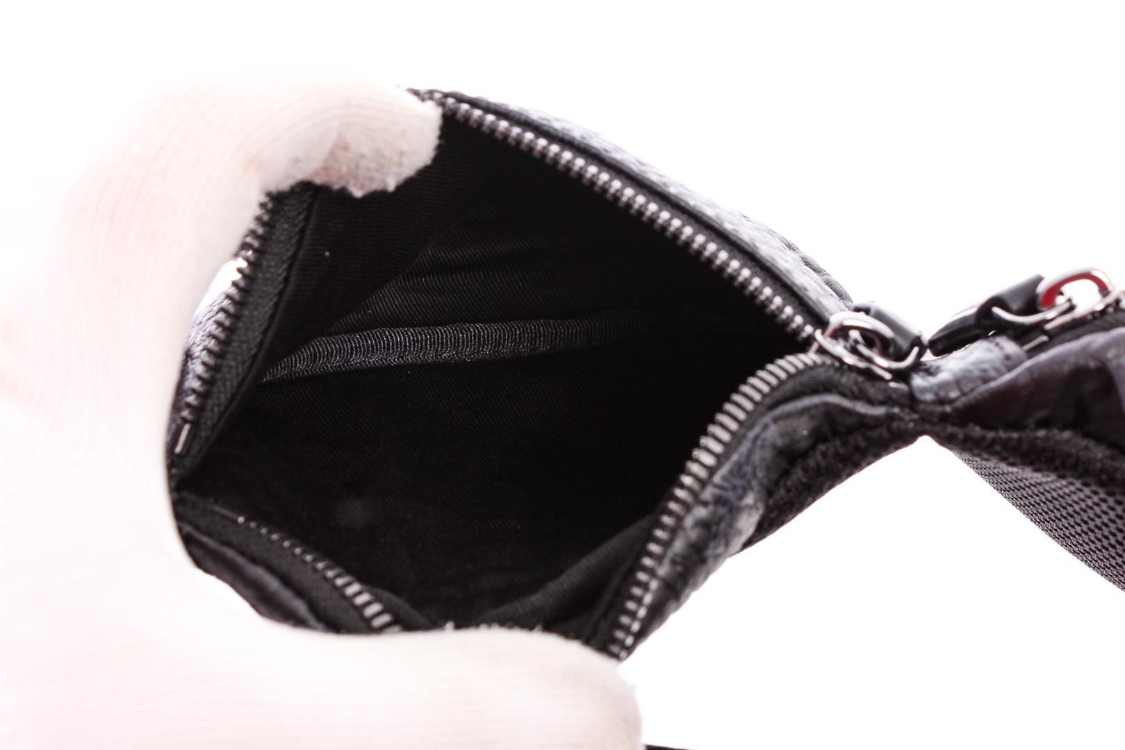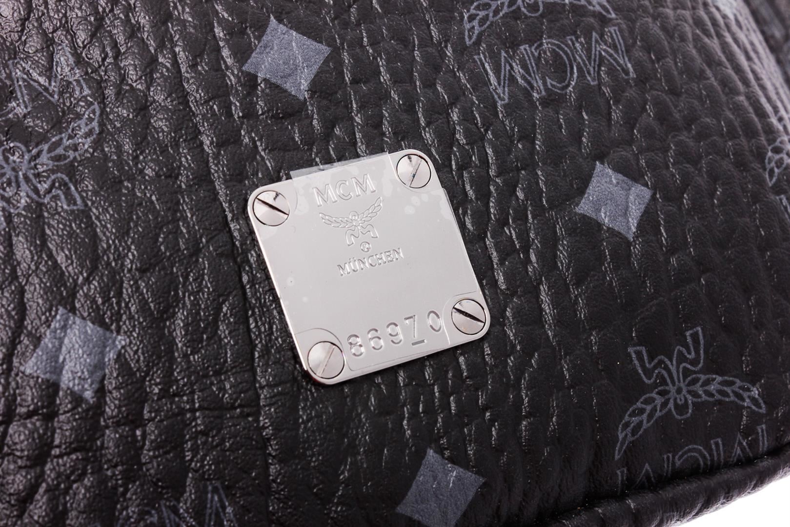Black MCM visetos coated canvas Large Jemison sling bag with silver-tone hardware, debossed metal plate at front, three exterior zip pockets; one with slip pocket, black fabric lining and adjustable logo belt strap.