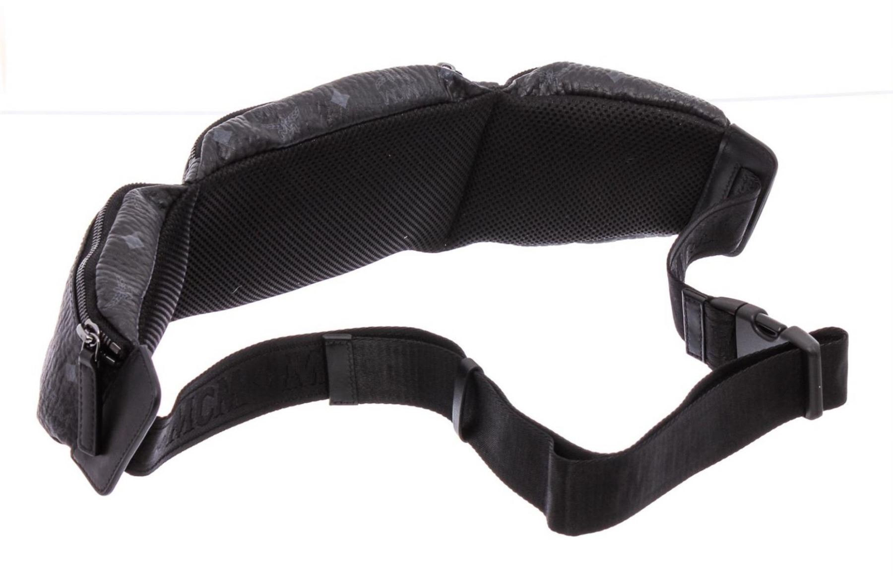 Black MCM visetos coated canvas Large Jemison sling bag with silver-tone hardware, debossed metal plate at front, three exterior zip pockets; one with slip pocket, black fabric lining and adjustable logo belt strap.