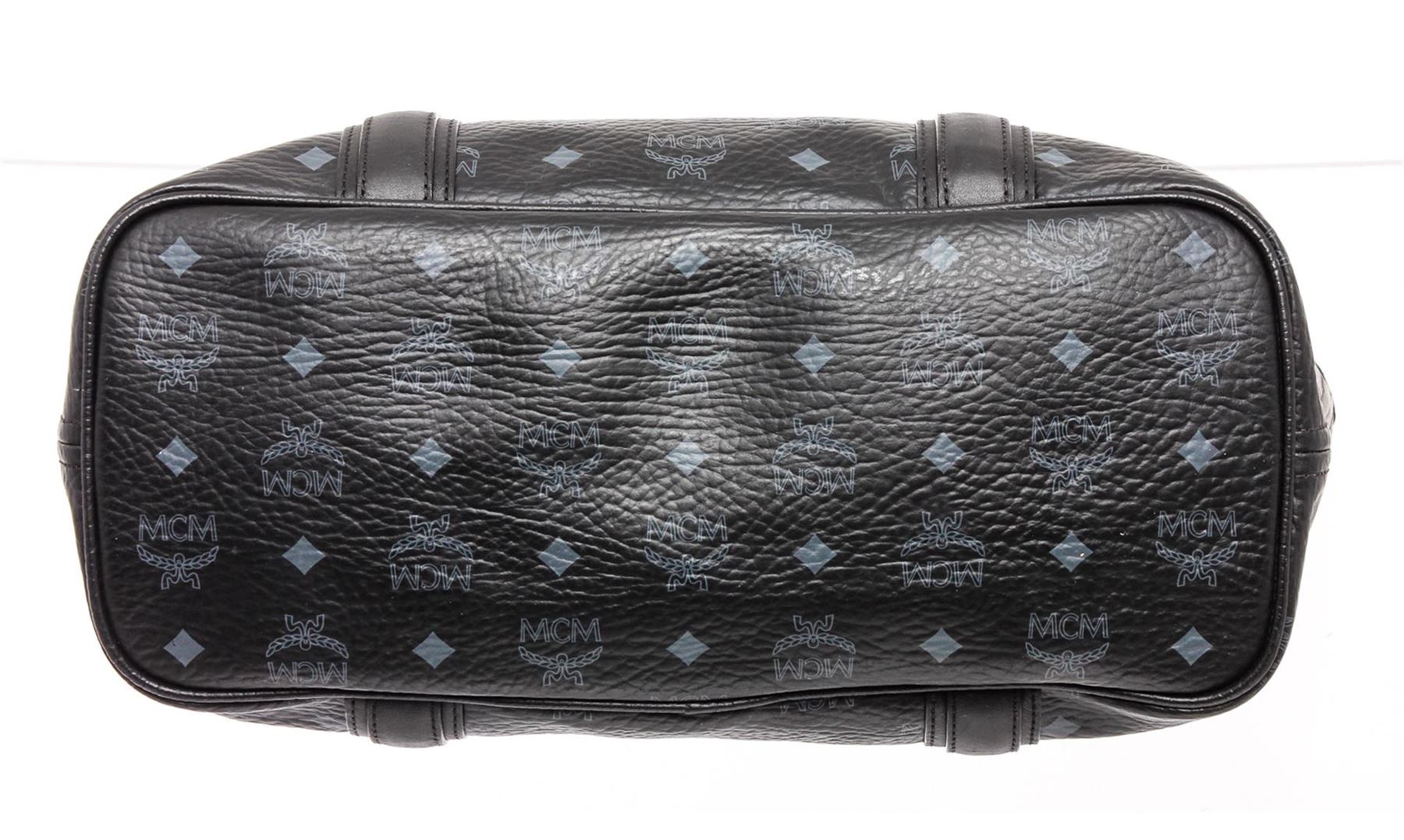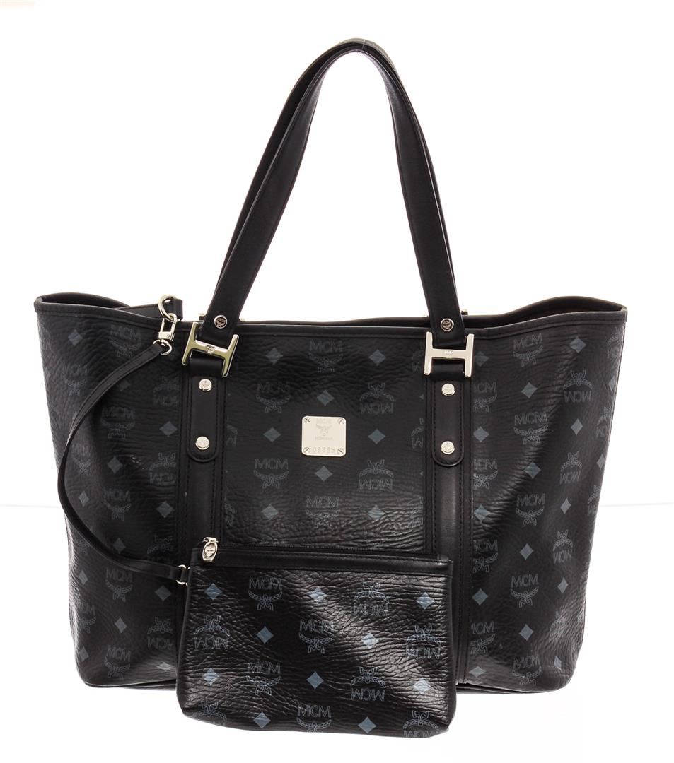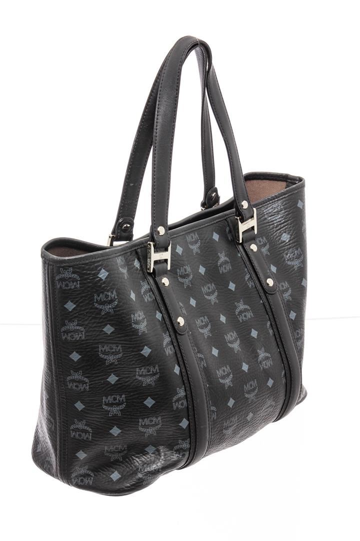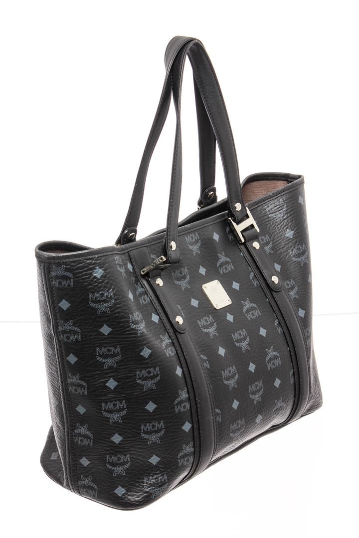 Black Visetos MCM coated canvas and leather trim large tote bag with silver-tone hardware, dual flat handles, tonal canvas lining, one zip pocket at interior wall with pochette insert and magnetic snap closure closure at top.