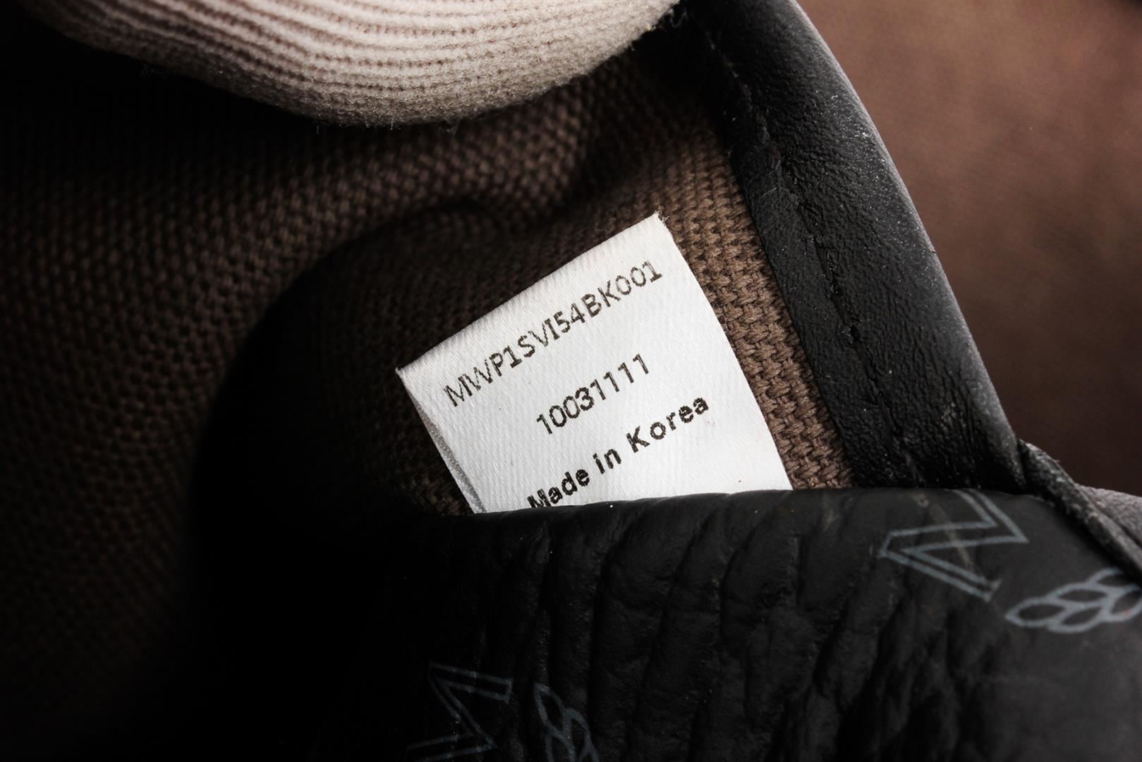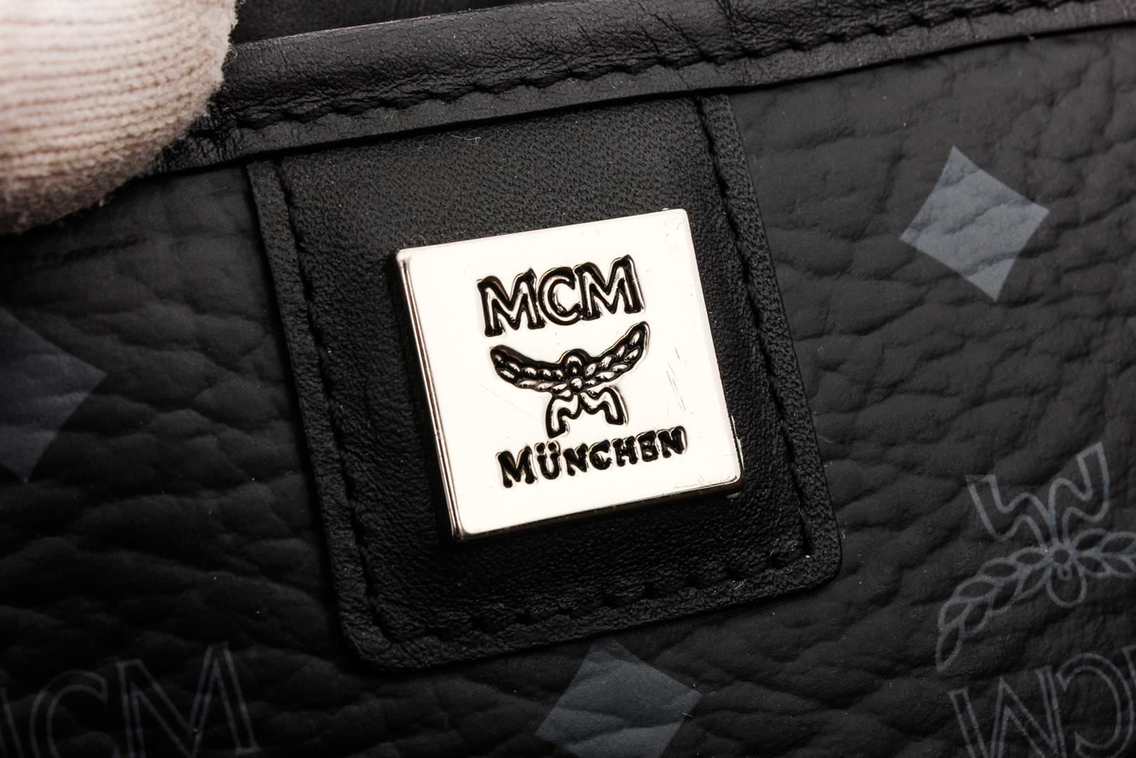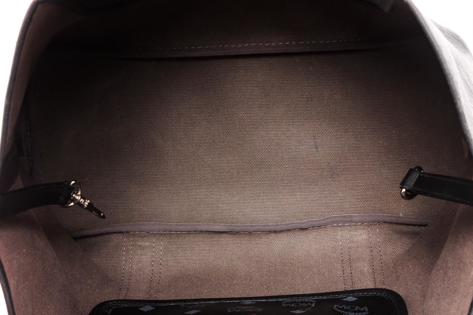 Black Visetos MCM coated canvas and leather trim large tote bag with silver-tone hardware, dual flat handles, tonal canvas lining, one zip pocket at interior wall with pochette insert and magnetic snap closure closure at top.